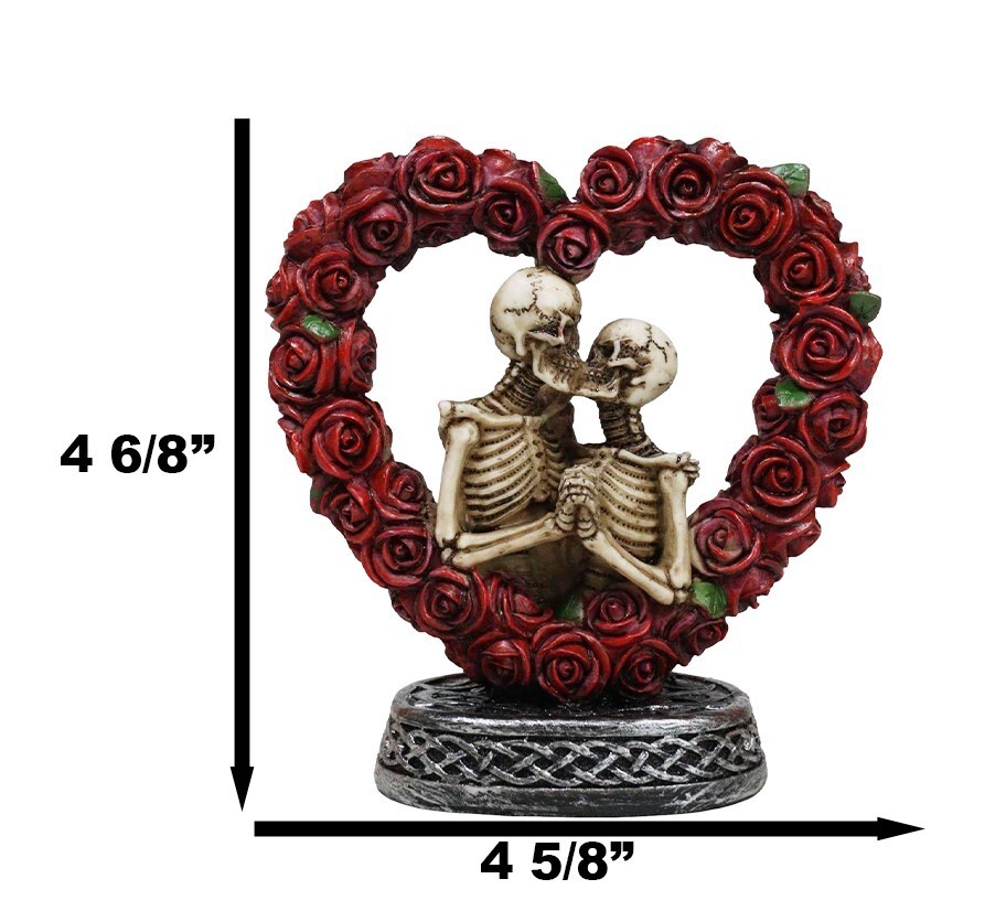 Love Never Dies Roses On Heart Wreath Kissing Skeleton Couple Bronzed Figurine