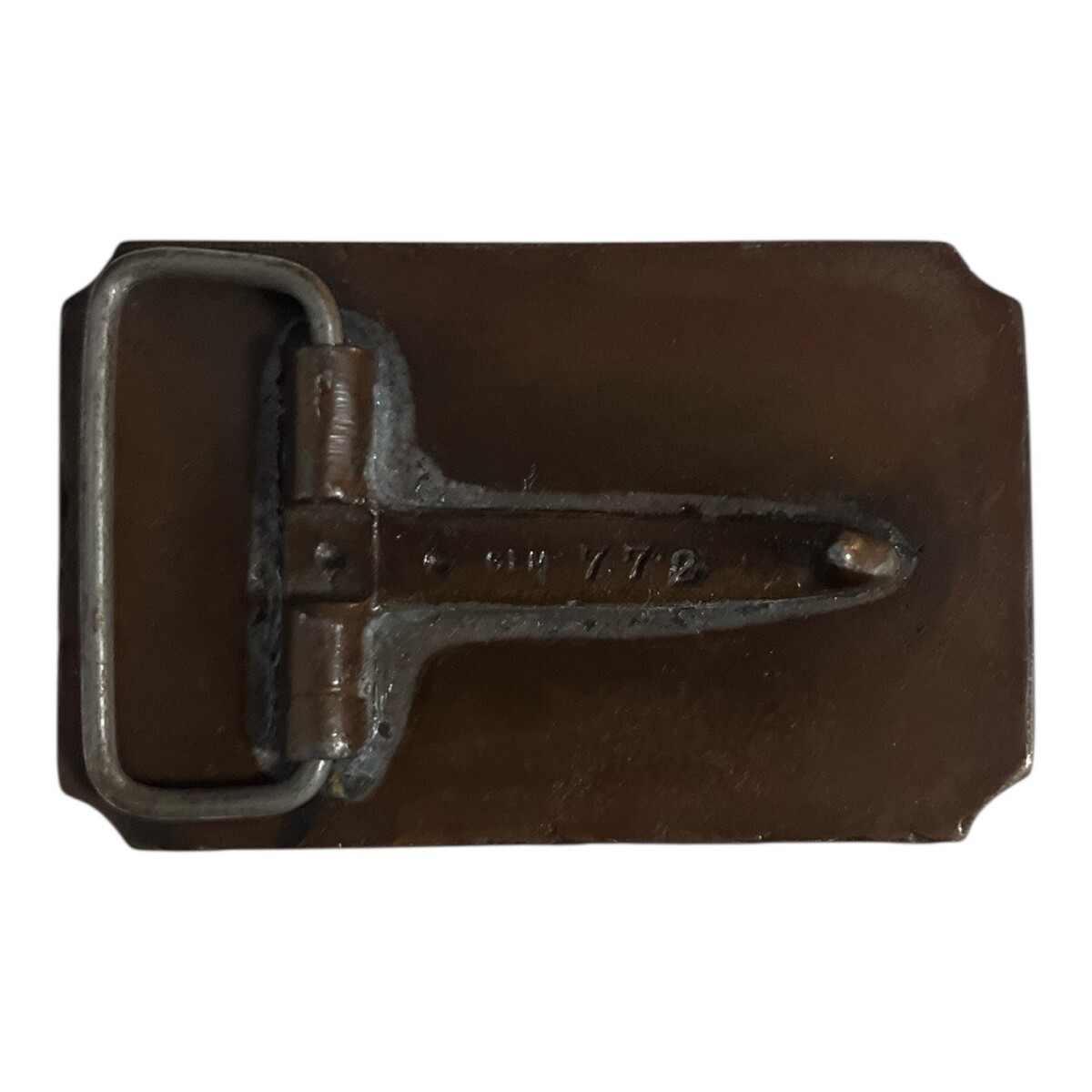 The buckle has a substantial feel and displays authentic surface patina consistent with age. The reverse shows the original belt loop and prong, securely attached and fully functional.