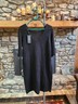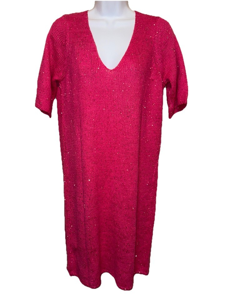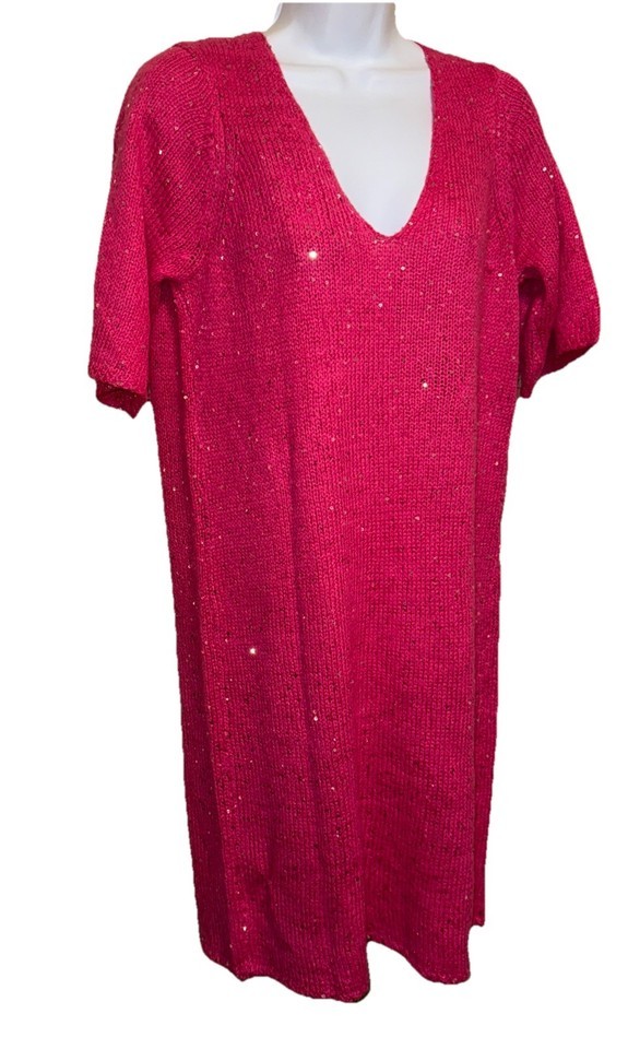 Shimmering sequins highlight a soft knit sweater-dress fashioned with a dipped V-NECK and abbreviated sleeves.
