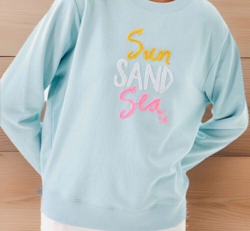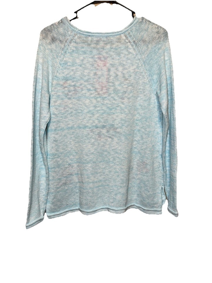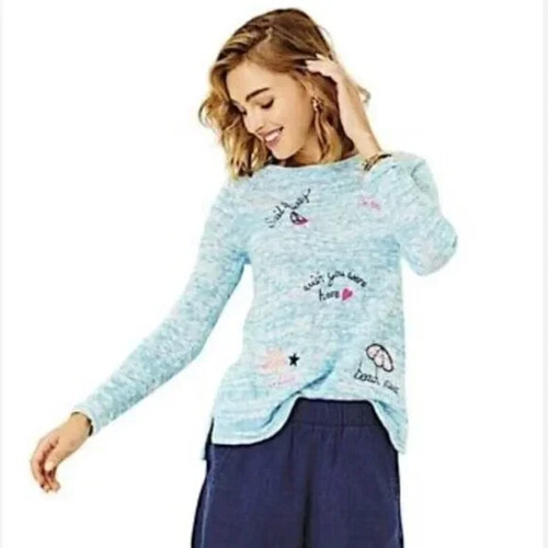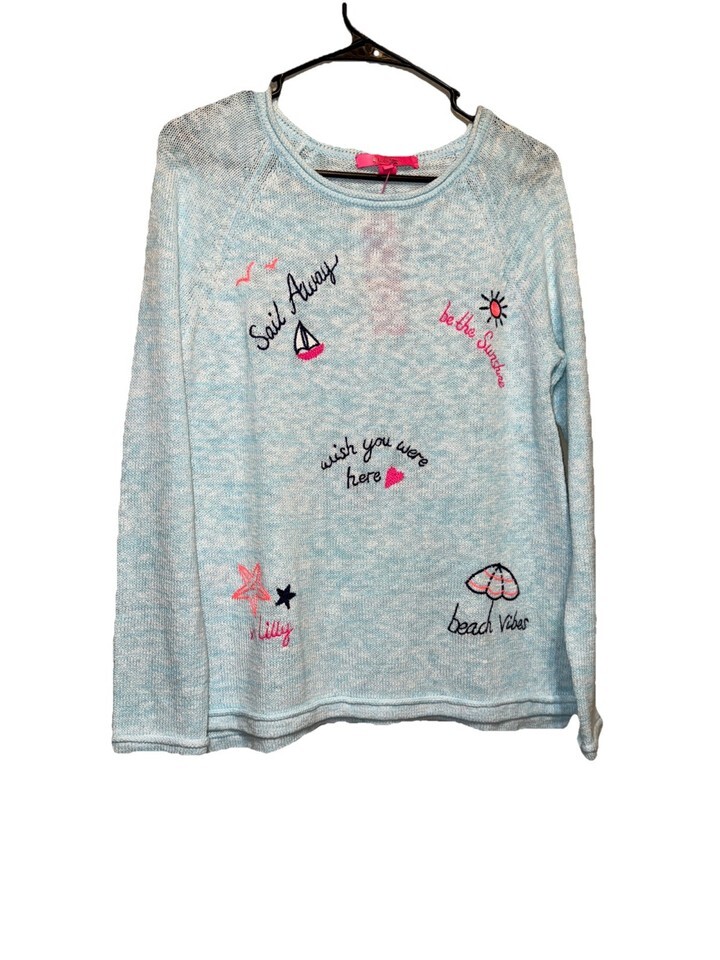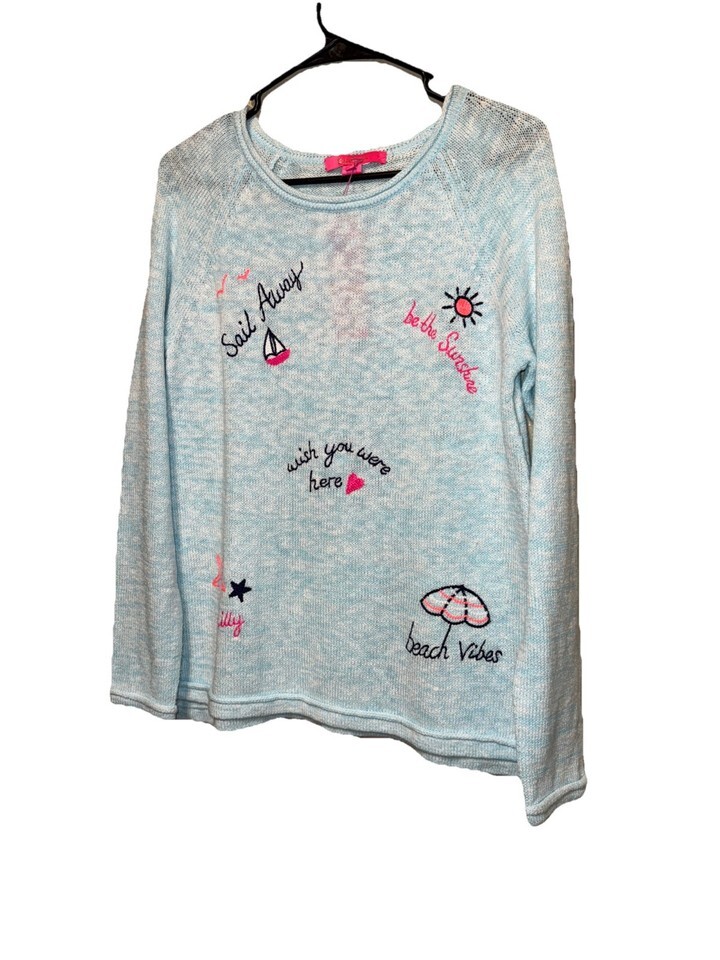 Chic and comfortable Lilly Pulitzer sweater in a beautiful sky-blue. Size is Small. Blue knit with white threads and embroidered messages on front. Large round neckline makes it easy to wear. Perfect for casual days and chilly nights. Whether you are at the beach or wish you were there, this lightweight sweater brings all the seaside vibes. vacation/cruise getaway.