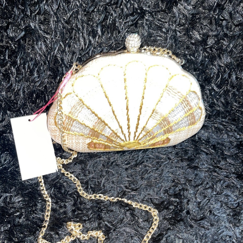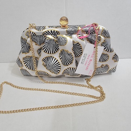 The Isaac Mizrahi Straw Browns Yellow Shell Chain Crossbody/Clutch is a stylish and versatile accessory for women.