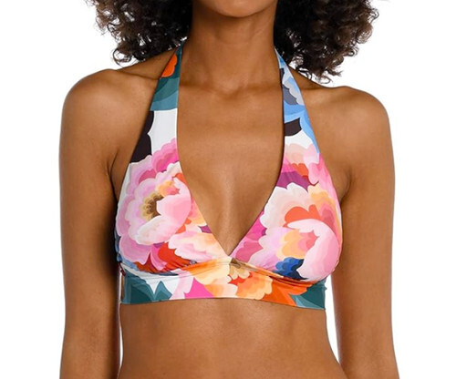 Features: Two-piece bikini set comes with halter top that ties at the neck and back, and bikini bottoms. Colorful Hawaiian Garden Print. Top has removable padded cups (included) and metal ring detail at the strap attachment.