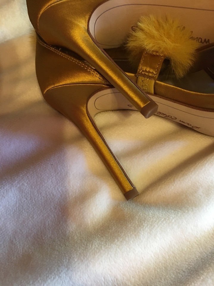 Sam Edelman satin pumps with faux-fur (polyester) trim.