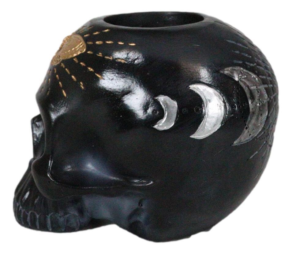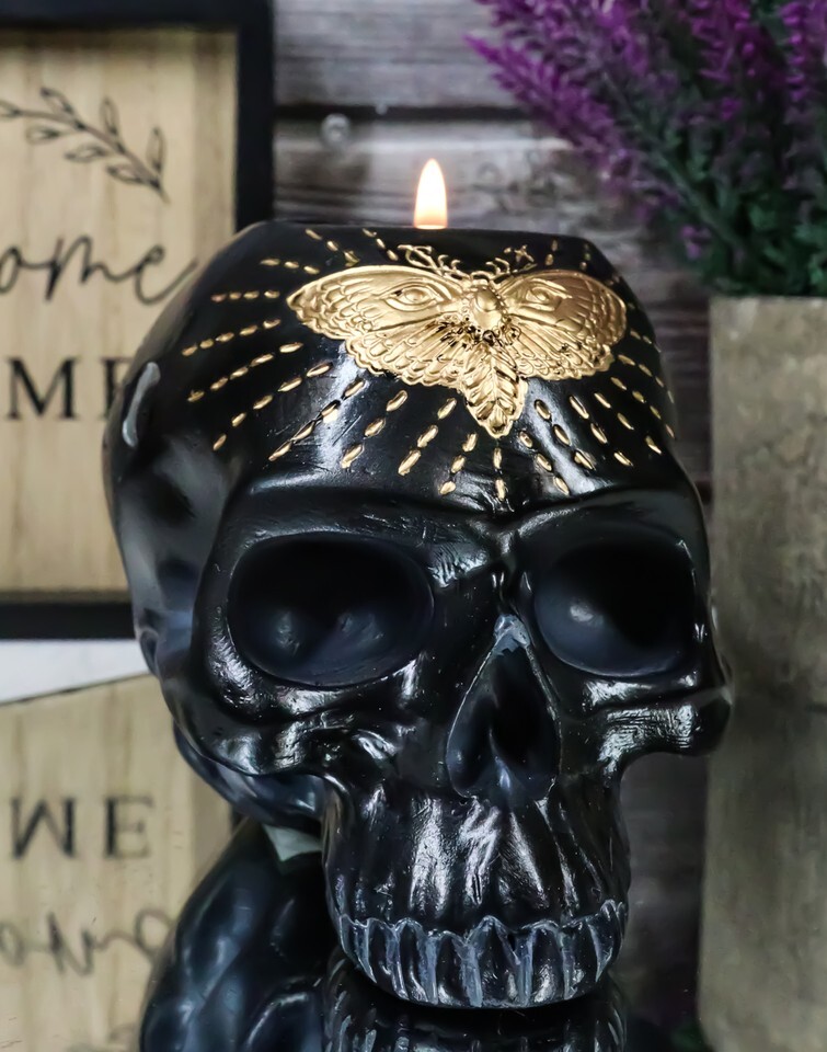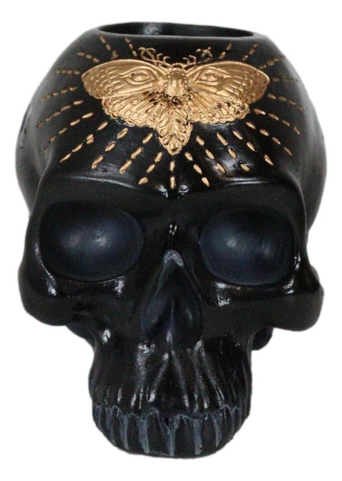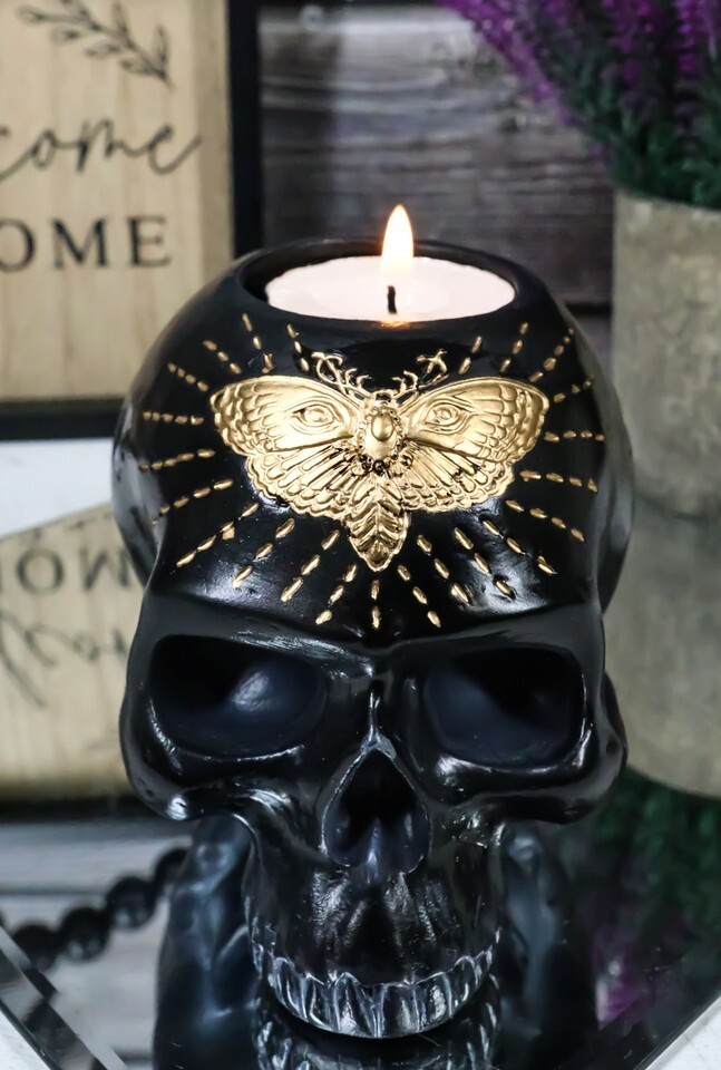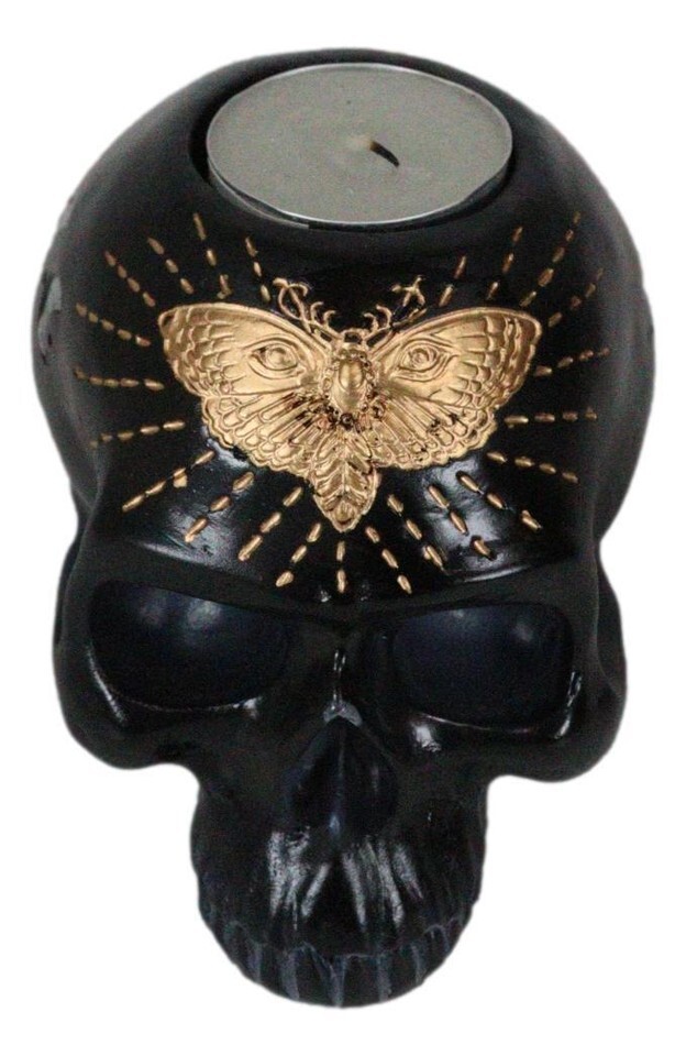 Ebros Black Gothic Skull Skeleton With Golden Butterfly And Evil Eye Candle Holder