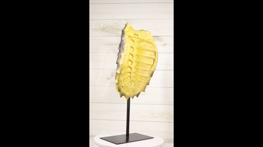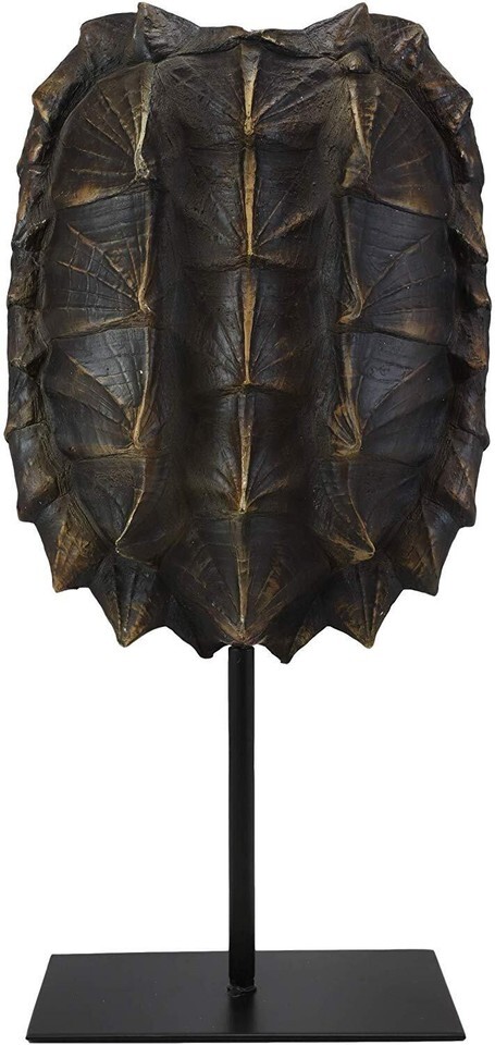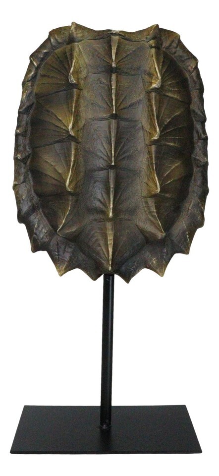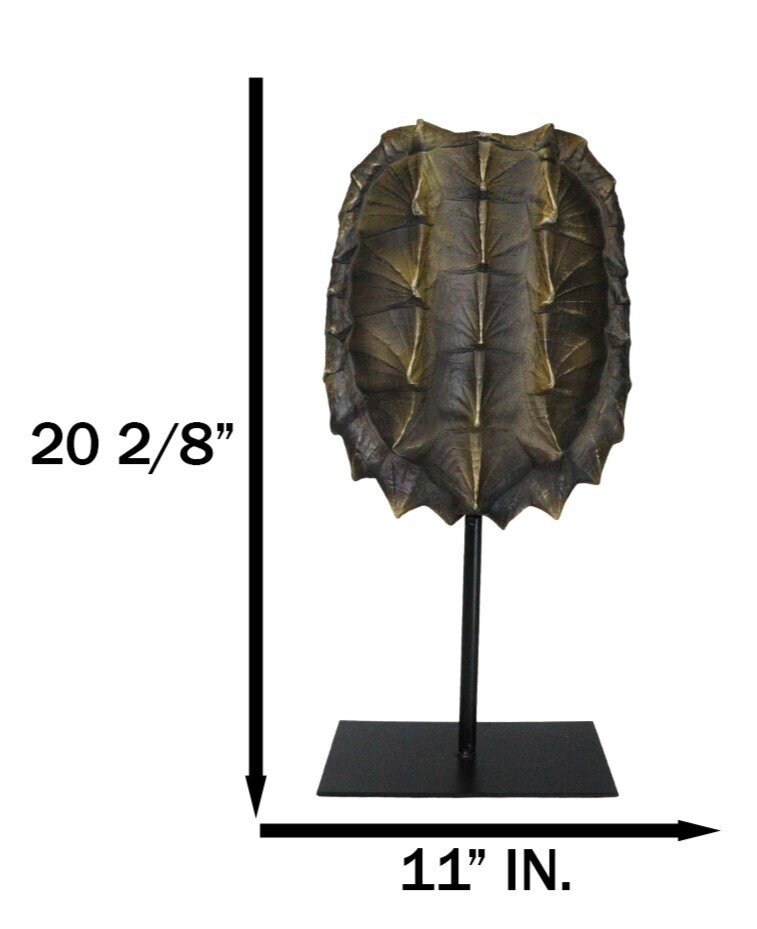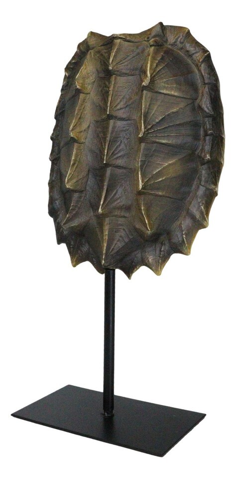 ? Hear the call of the wild! This unique and attractive sculptural accent is a faithful recreation of the exotic alligator snapping turtle shell, artisan-crafted of resin and finished in a two tone color of brown and yellow. On a contemporary metal pole, with a rectangular base, the shell sculpture is displayed beautifully. Meticulous craftsmanship of the shell and the gallery style pole stand makes this decorative accent a must have for any discerning and sophisticated decorator.