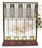 ? Adapted from the complex rectilinear design of the art glass skylights in the impressive entrance of Frank Lloyd Wright's Studio (Oak Park, IL, 1898). Painted with transparent enamels, kiln-fired framed in wood. Wood stand included and hardware for hanging included (refer to photos).