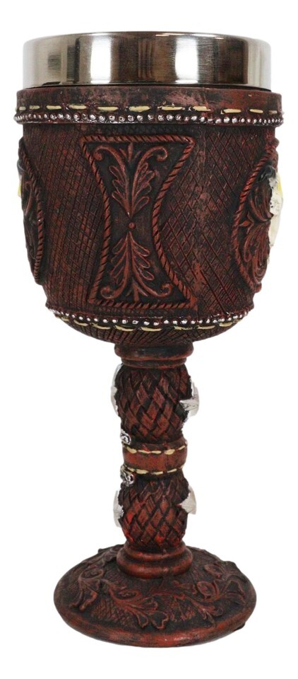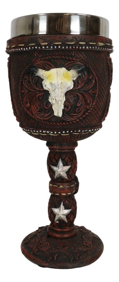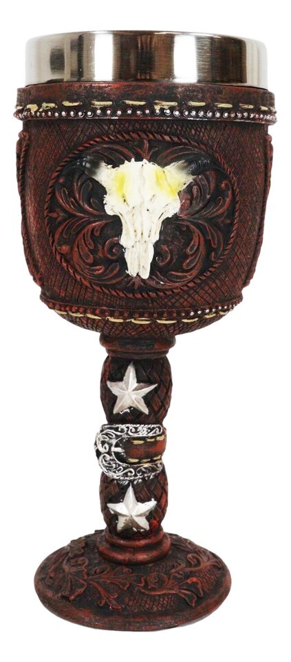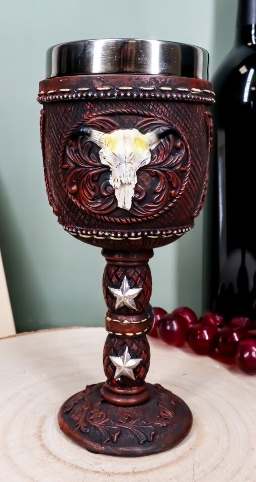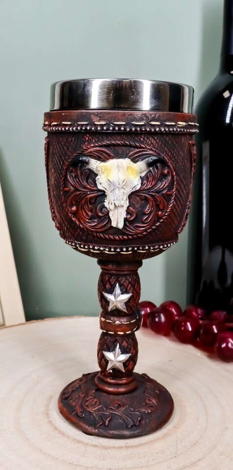 ? This Western Cow Skull And Western Stars Wine Goblet is perfect for your western themed parties or as a functional home decor! This western themed larger than life wine goblet boasts of all American western themed articles such as the bull cow skull, floral scroll lace patterns, horseshoes and all put together in a tooled leather finish. The borders of the wine goblet body are also embellished with stitch marks to complete the rustic charm of the Wild West Old World accent.