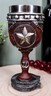 ? This Western Cow Skull And Western Stars Wine Goblet is made of high quality resin with stainless steel liner, individually hand painted and polished. Color Tone May vary from pictures. Handwash only, applying soap to the stainless steel liner cup but using warm water/very mild soap on the resin housing.