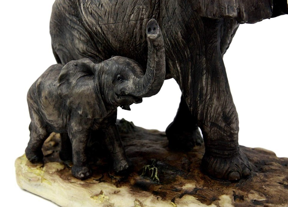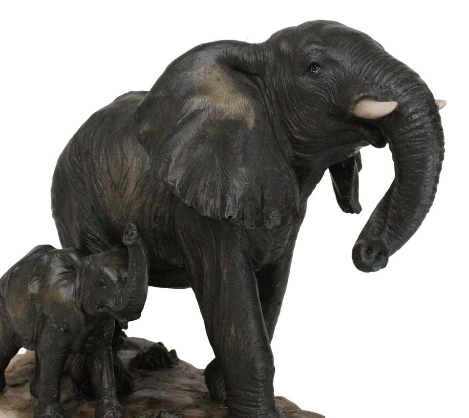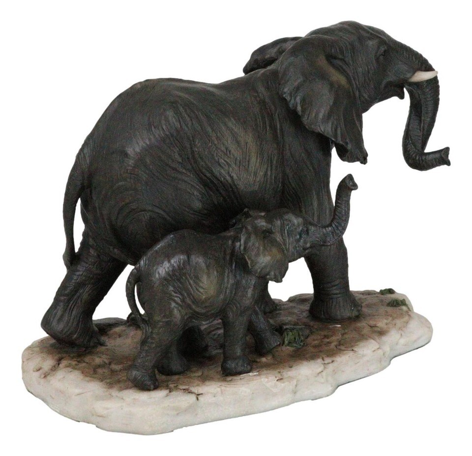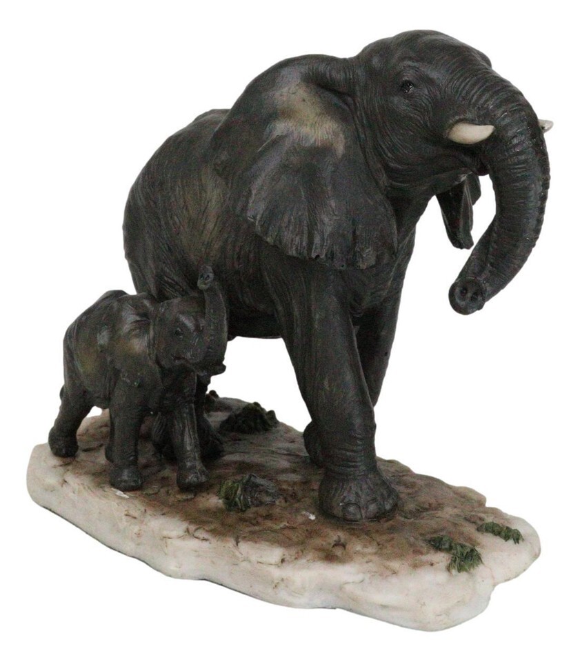 ? This beautiful Elephant With Young Calf figurine portrays the noble elephant and his care for his family and calf in particular. The figurine is sculpted with a grassland savanna setting. The male tusked elephant is the centerpiece of the figurine while a cute calf is set at the base of the figurine. If you love nature and all its beauty, you will appreciate this artwork!