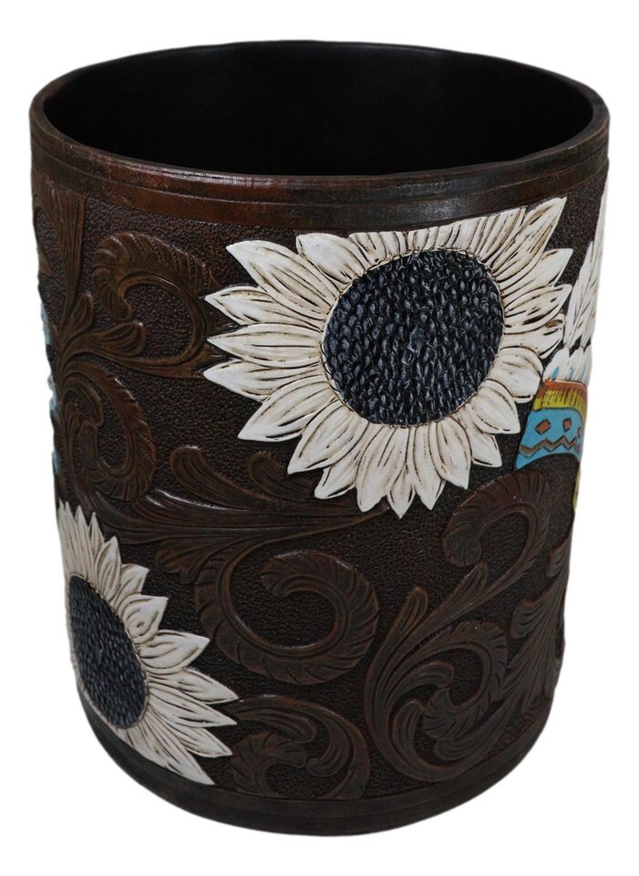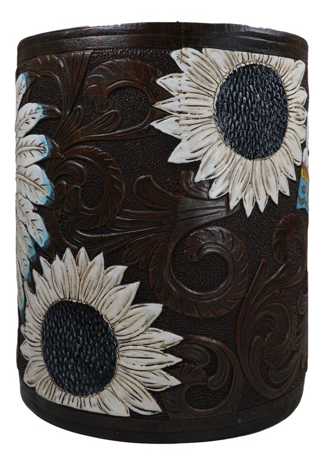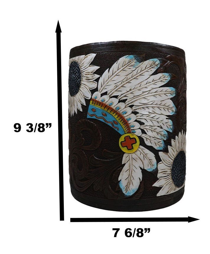 ? This Western Indian Headdress In Faux Tooled Leather Scrollwork Waste Basket is made of designer polyresin, hand painted and polished individually. Our artisans have created a visual facade of leather through skillful painting and sculpting.