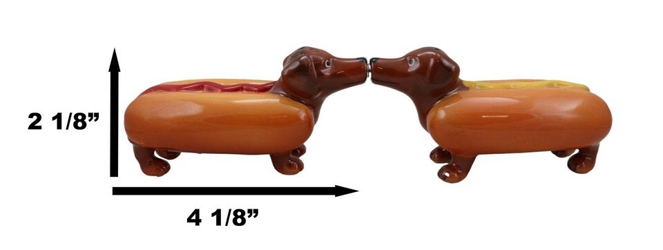 ? These Hot Dog Dachshunds salt pepper shaker set measure approximately 2.75" tall, 4.75" wide and 2 1/8" deep each.