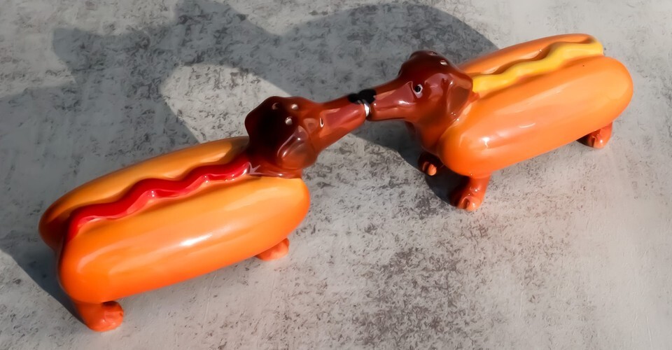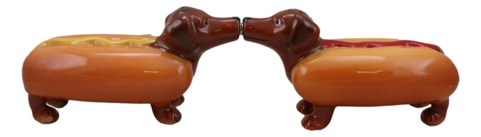 ? Add some flair to your kitchen and dining setup with these cool salt pepper shaker set. We feature two star crossed lovers dachshunds with the body of a hot dog bun stuffed with a wiener and mustard/ketchup.