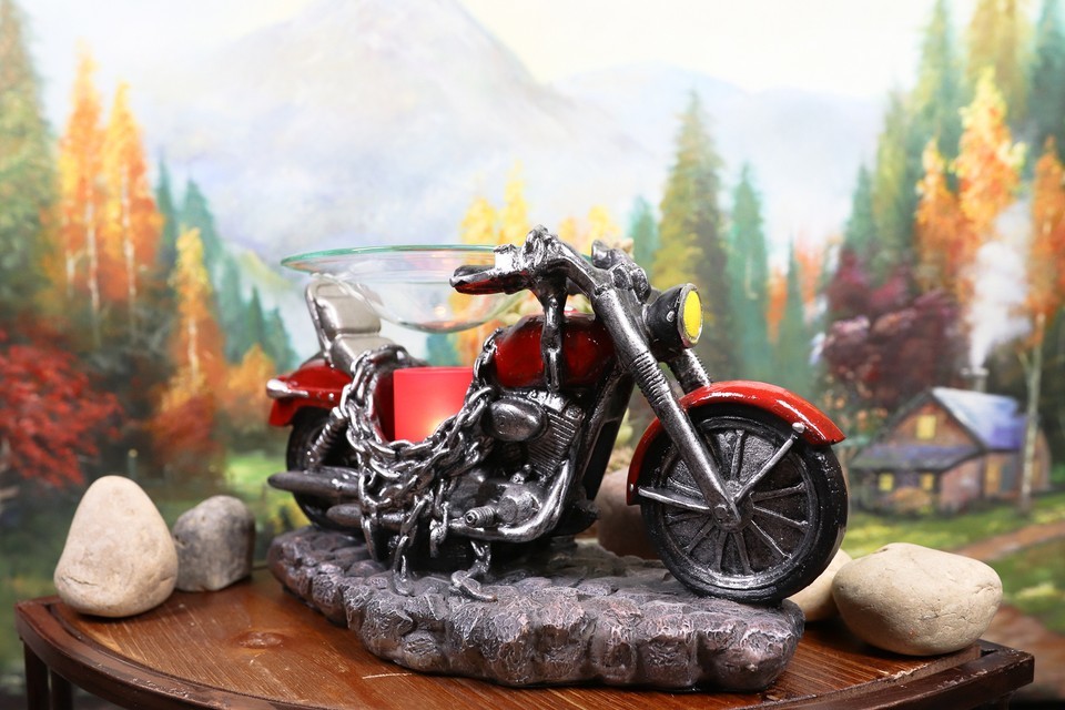 ? Vintage motorcycle enthusiasts will love the sleek appearance of this lean and mean cycle oil warmer figurine. This faithfully crafted classic "road hog" looks ready for the open road with lifelike attention paid to every detail from the taillight to the headlight. We also add a series of chains to the bike to make the bike look more wicked and cool! Makes for the perfect Christmas or any occasion's gift for bikers or as an addition to a collection of nostalgic motorcycle models.