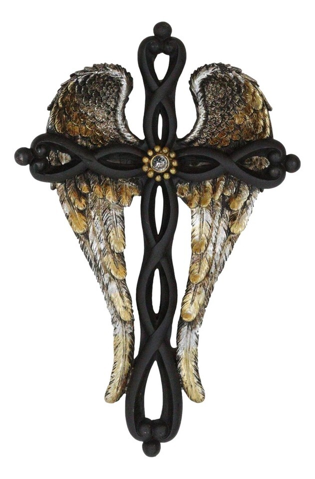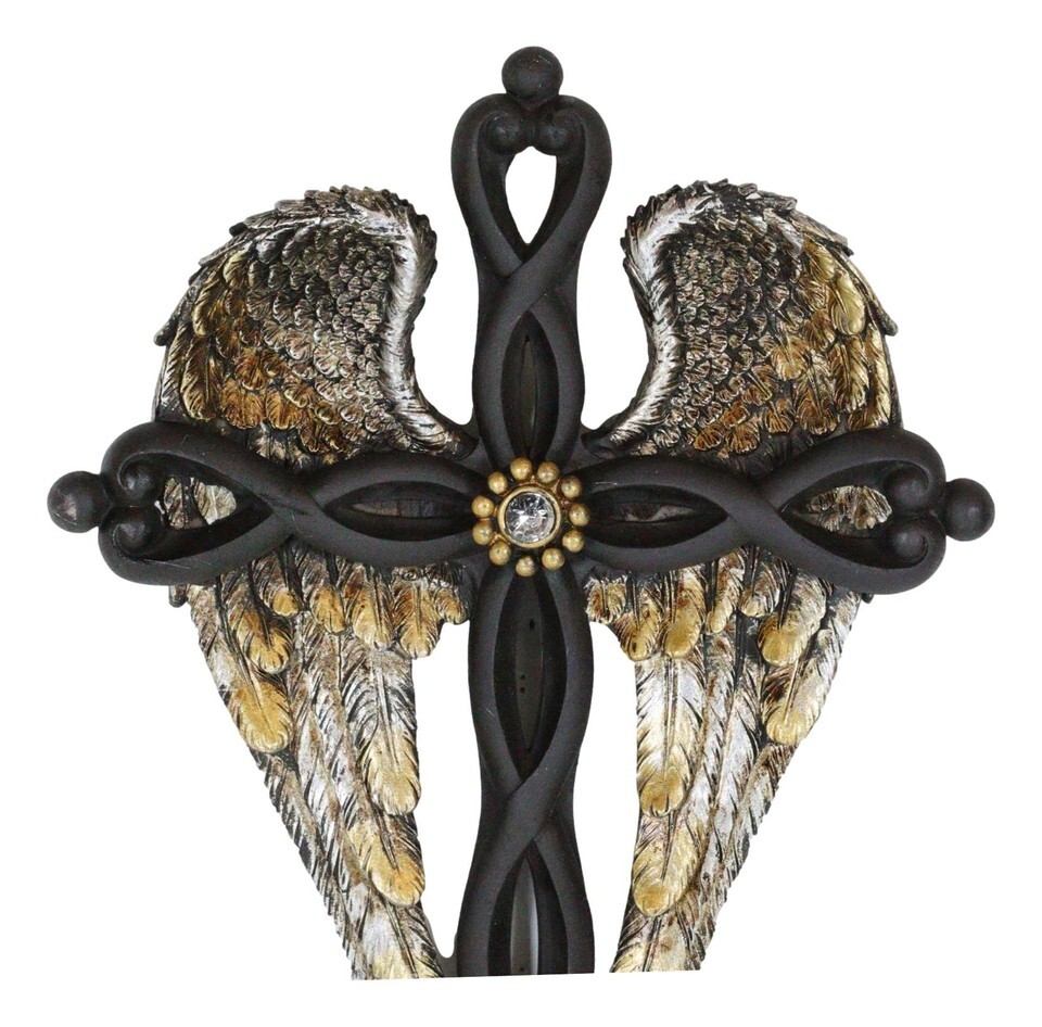 ? This dramatic wall cross is designed with twisted black knotwork beams and golden angelic wings. It is the perfect inspirational decor for your wall, whether as a standalone cross or as a colage with other wall decoratives.