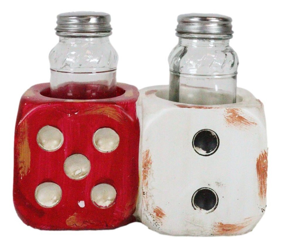 ? This Classic Red And White Double Dice salt and pepper shakers set is made of high quality polyresin, hand painted and polished. They are equipped with two glass shakers as pictured without the condiments.