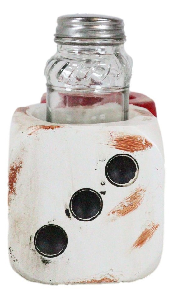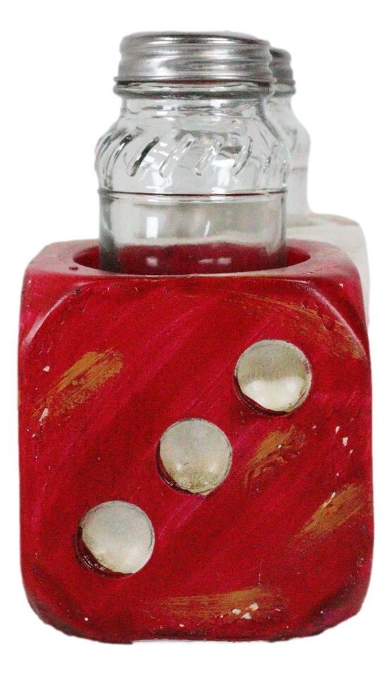 ? Whether you have a keen affinity for 'risk amnagement' i.e. gambling or board games and such, this kitchen condiment organizer/holder sculpture will impress! Shaped in oversized dice, the sculpture is hand painted for a classic distressed look of red and white. 2 Glass shakers are provided and will insert nicely into the two holes from the top! A welcome gift for that special someone in your shopping list!