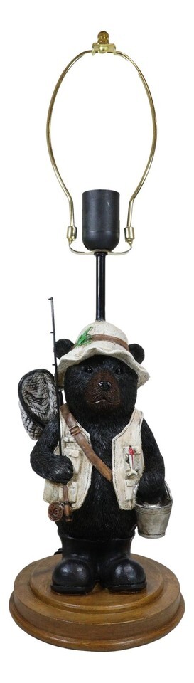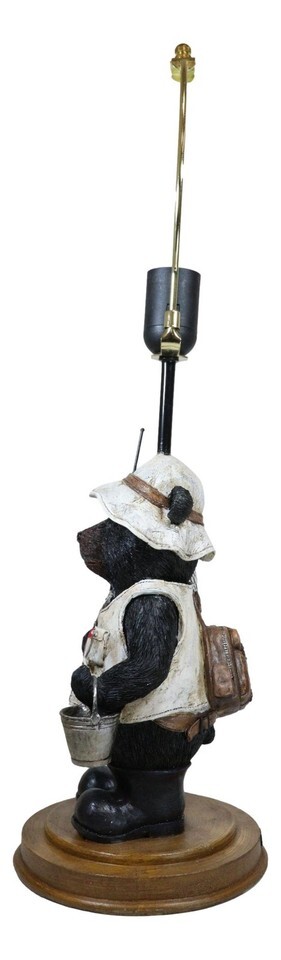 Camping Fisherman Angler Bear Going Fishing With Pole Net And Bucket Table Lamp