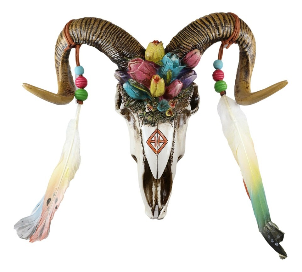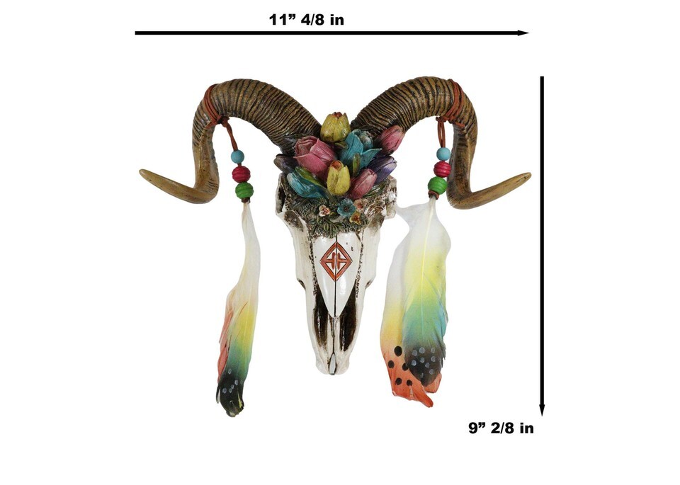 Ebros Rustic Corsican Ram Skull With Flowers And Dreamcatcher Feathers Wall Decor