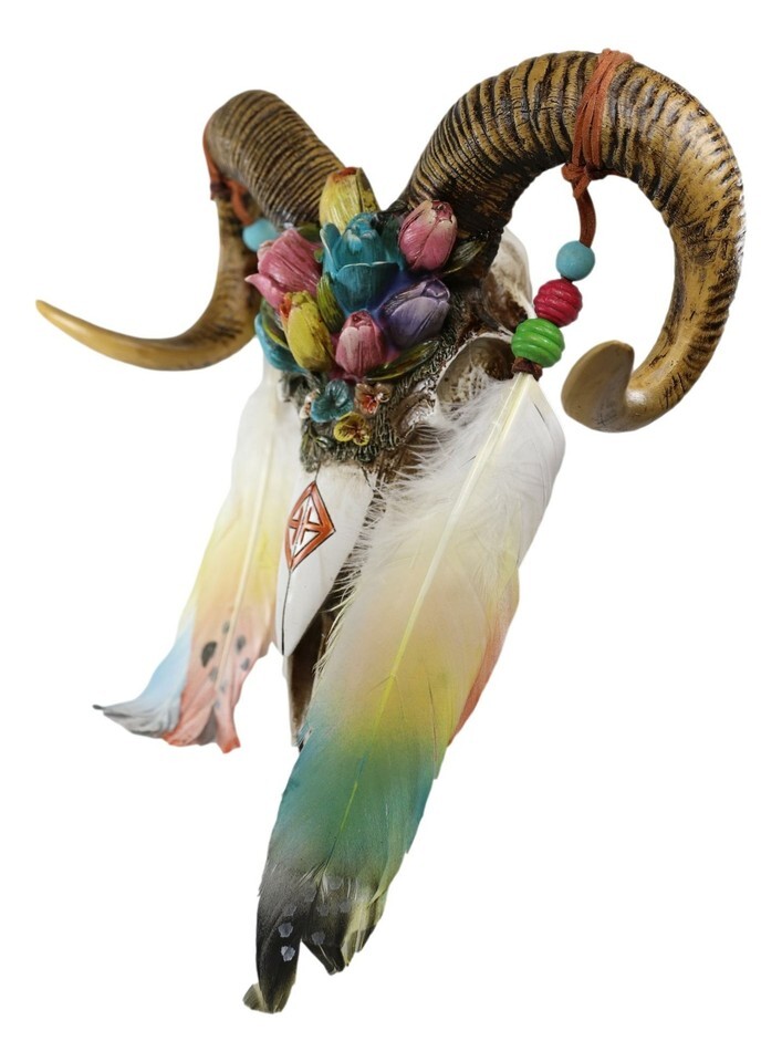 Rustic Corsican Ram Skull With Flowers And Dreamcatcher Feathers Wall Decor