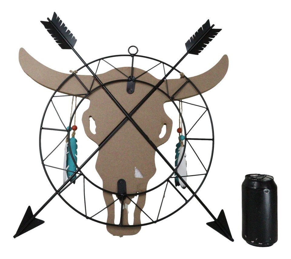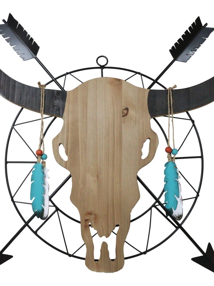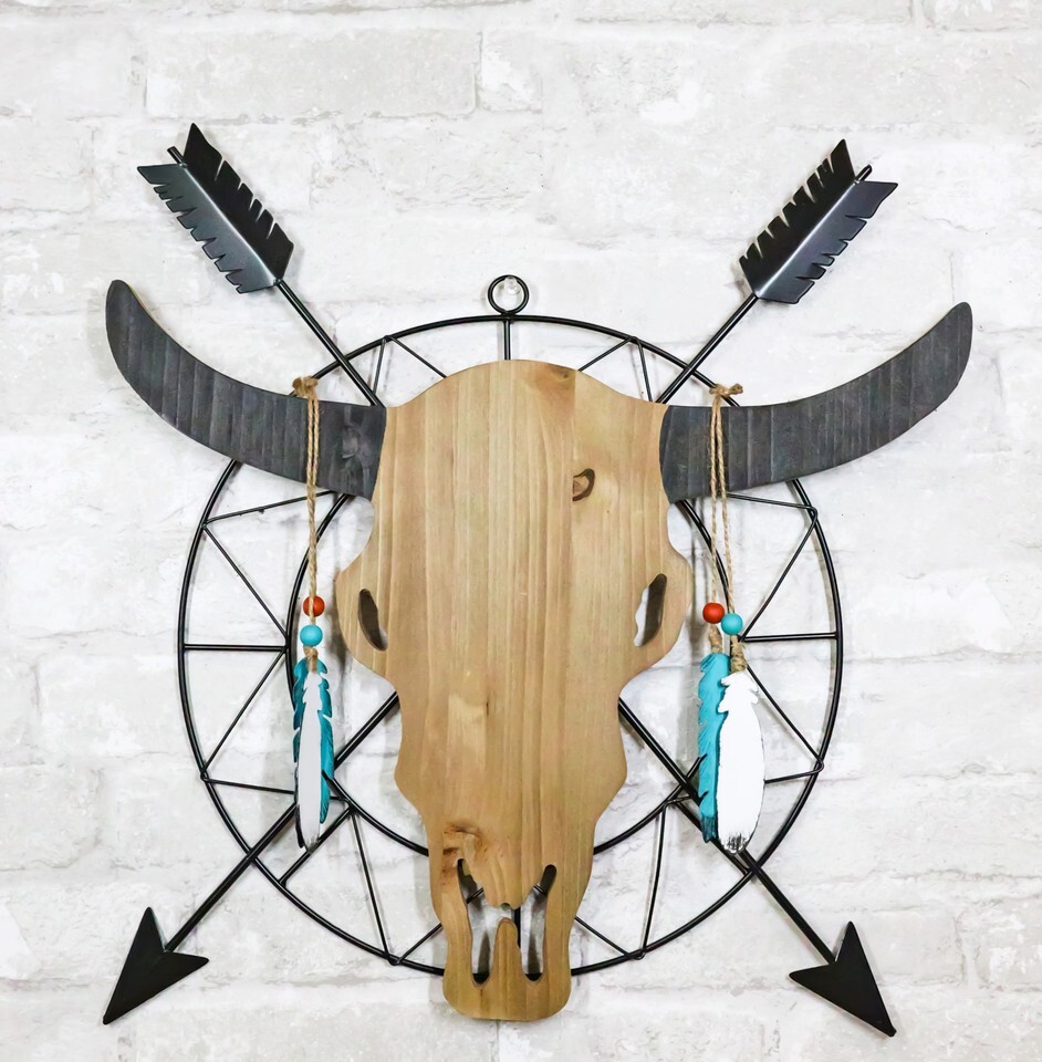 ? This Crossed Arrows Dreamcatcher Feathers Cow Skull Wall Sculpture is made of Wood And Metal, hand painted and polished individually.