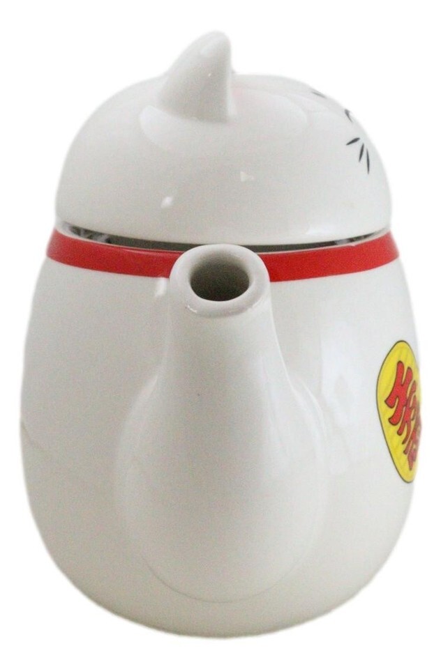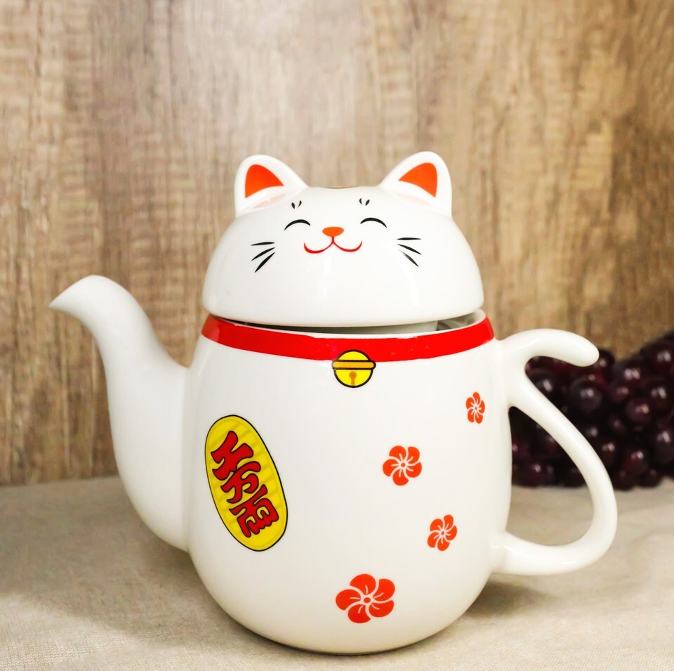 Japanese Maneki Neko Lucky Beckoning Cat Ceramic Tea Pot With Metal Strainer