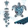 ? This particular wind chime features a top crown designed with a beautiful sea turtle swimming gracefully over sea corals with white blue and red colors. Hanging from the crown are aluminum rods as well as decorative ornaments of blue and red sea coral clusters.