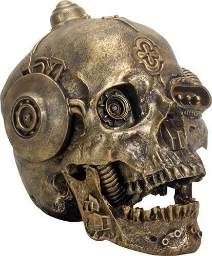 ? This steampunk skull sculpture is made of high quality polyresin. It is meticulously hand painted and polished. Color tone may vary from pictures.