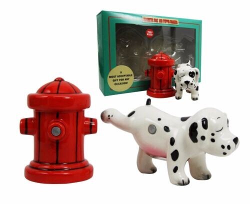 ? This Dalmatian Peeing On Fire Hydrant salt pepper shaker set is made of high quality glossy ceramic, hand painted and polished.
