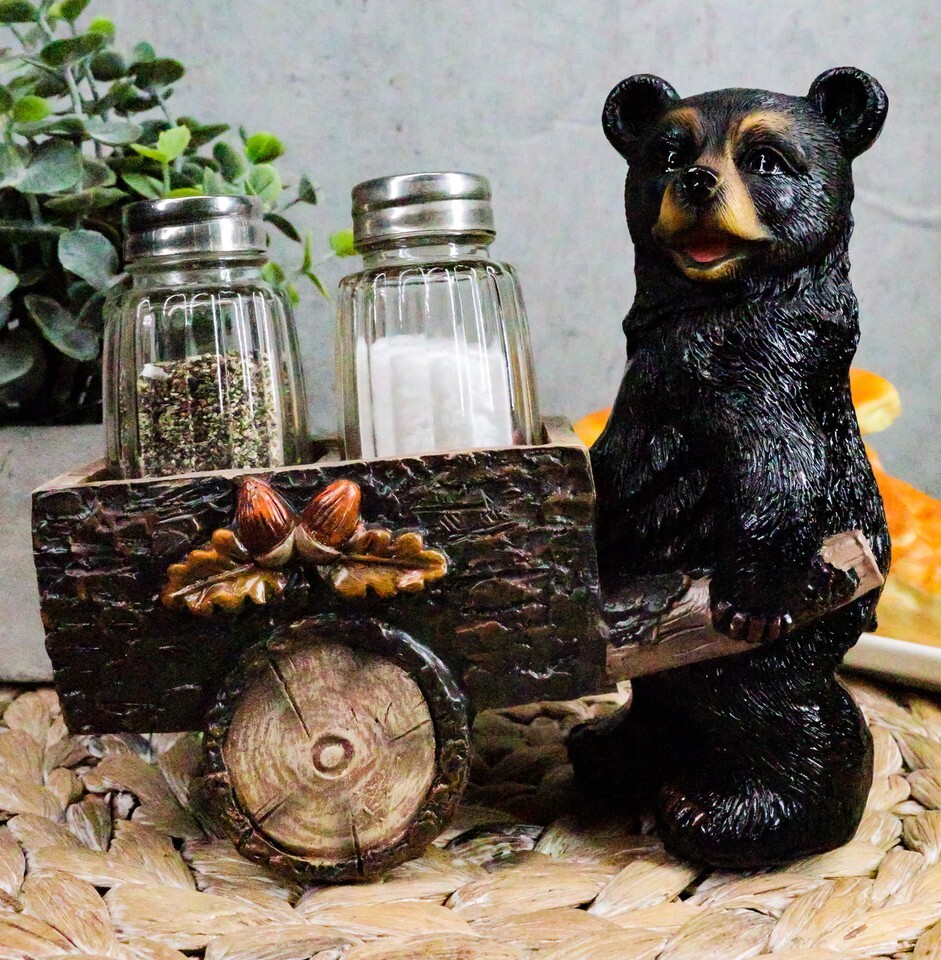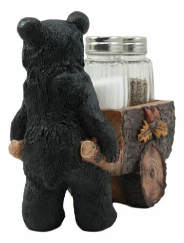 Ebros Black Bear Pushing Vintage Wagon Cart Salt And Pepper Shakers Holder Set