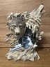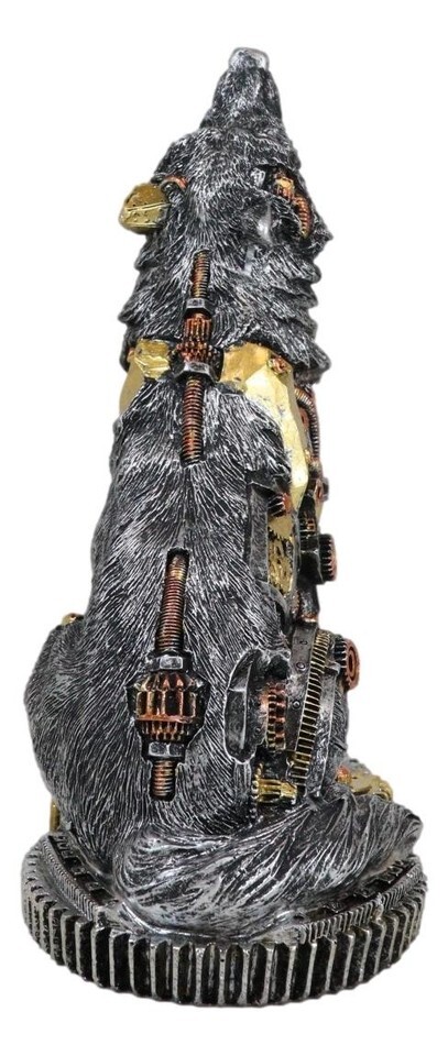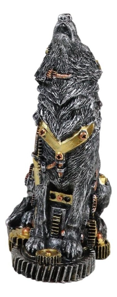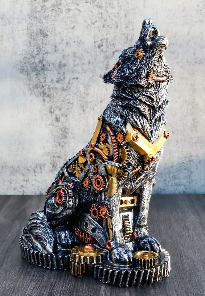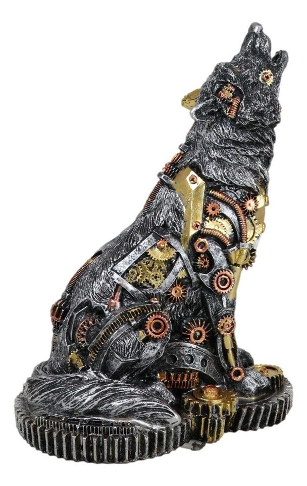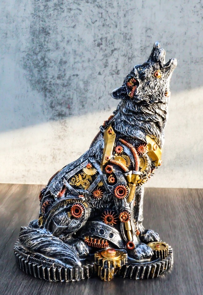 ? This is a futuristic cyborg wolf howling at the moon. He is a robotic steampunk prototype with sculpted gears and steampunk gas chamber technology. This wolf is a ferocious hunter; unparalleled in speed, agility and killer instinct. He stands out from the rest of the pack!