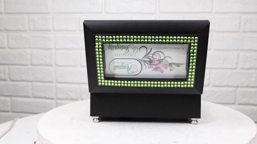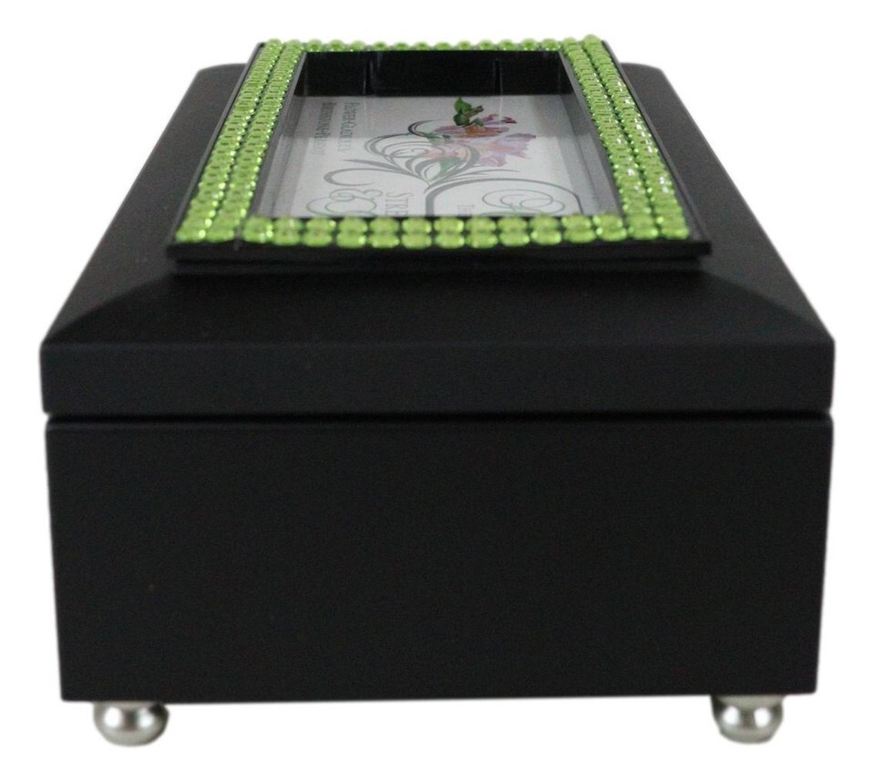 ? Beautiful birthstone jeweled photo frame lid and sweet word sentiment art gives this wooden music box a timeless appeal. Personalize this black box by replacing the sentiment artwork with 4 x 2 inch photo. Box is lined with protective rich velvet and padded feet. Quality hinges keep the lid upright when opened. Comes in nice packaging for easy wrapping. Attractive pretty jewels and gems from a border around the sentiment card.