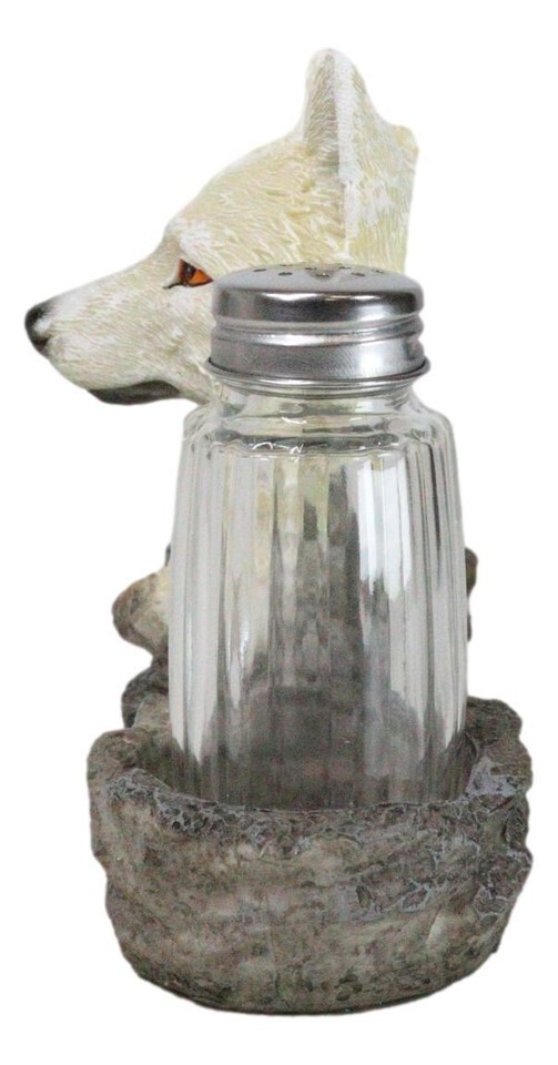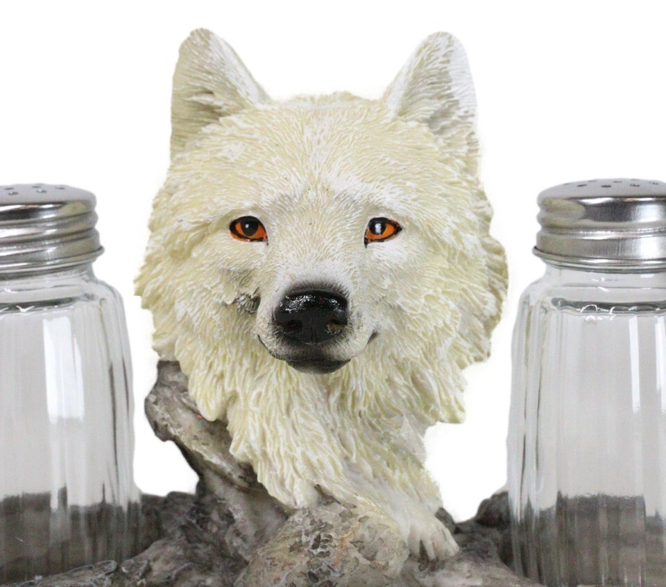 White Wolf Head By Woodlands Forest Glass Salt & Pepper Shakers Holder Figurine