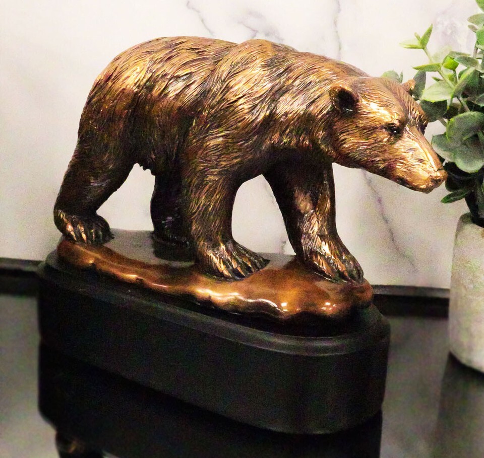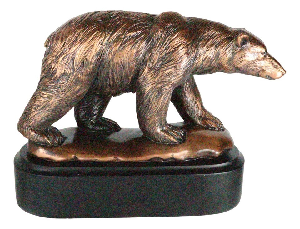 ? This Beautiful Polar Bear Sculpture is made of the highest quality resin, undergoing the process of bronze electroplating giving it a uniform shine on the inside as well as the surface of the figurine. To add sculptural aesthetics and display worthiness, we add accent faux black wooden base to the sculpture.