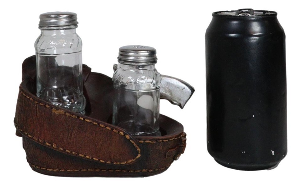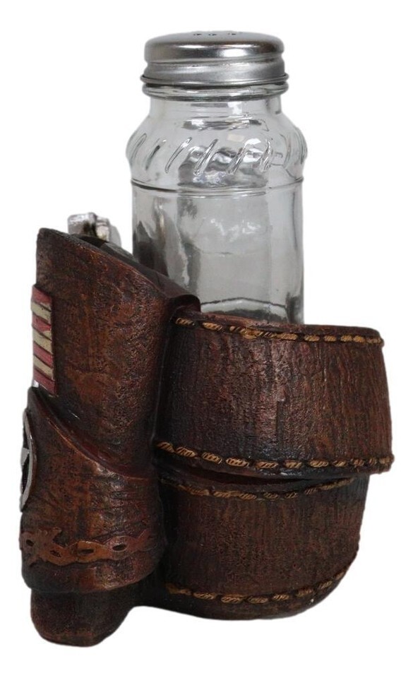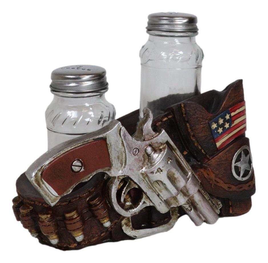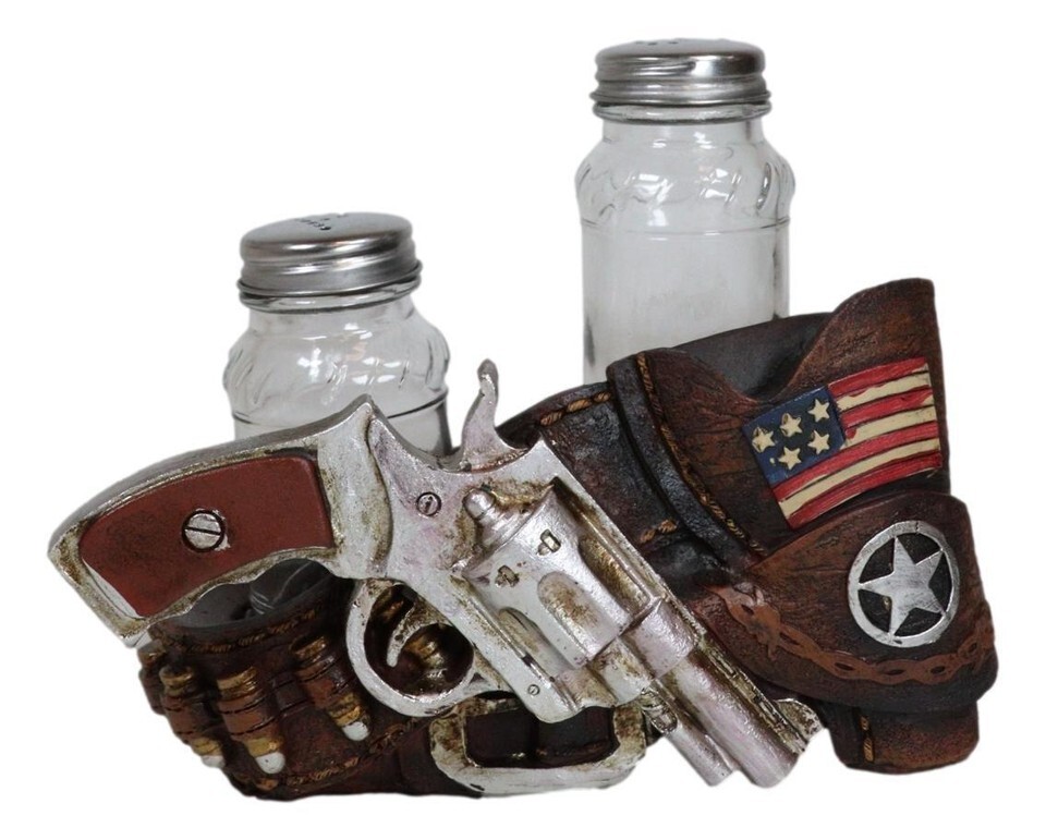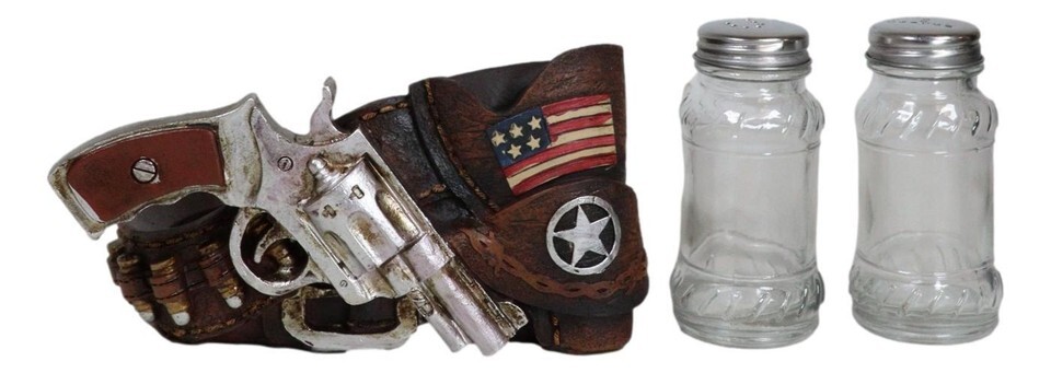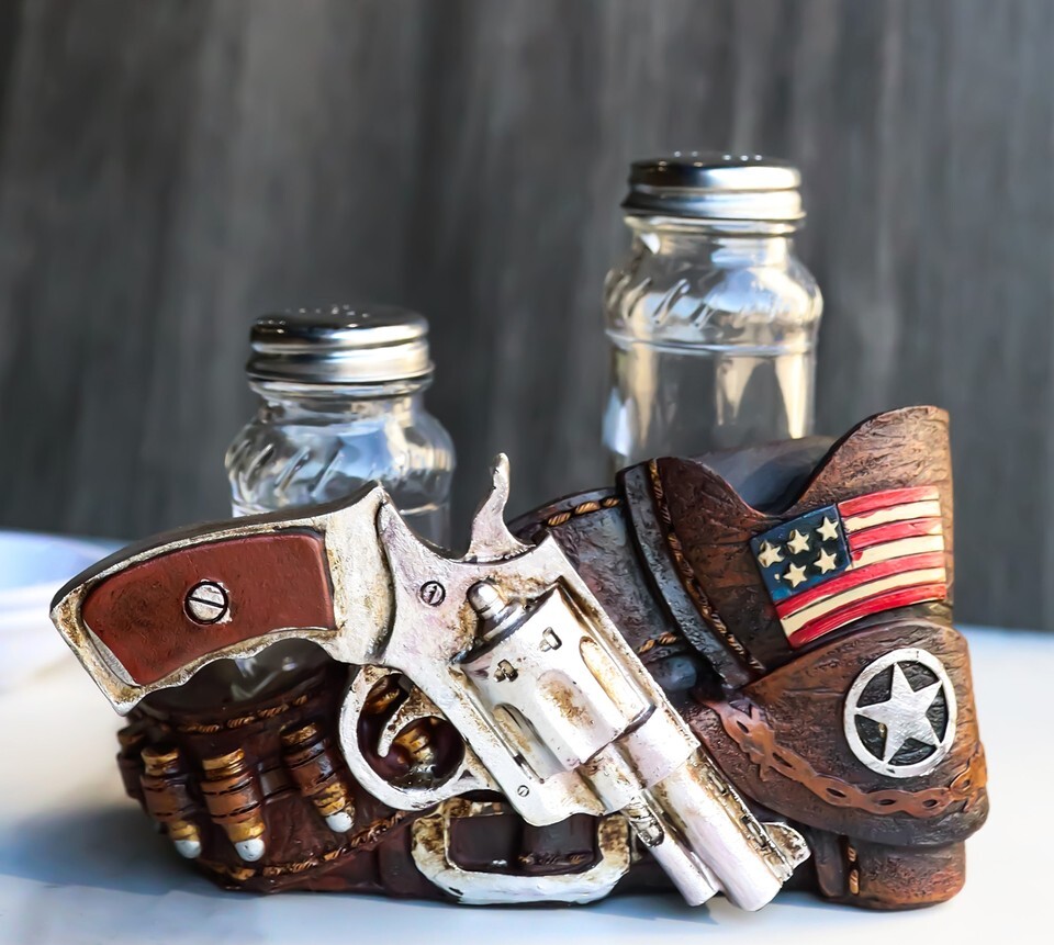 ? This Western Pistol With Holster Sculpture is a true frontier-inspired masterpiece for your dining table! Crafted with intricate detail and rugged charm, this pistol with holster and western star will transport you to the heart of the Wild West with every meal. Not only are they a captivating addition to your tabletop, but they also come with a stylish holder that keeps your salt and pepper shakers organized and within reach.