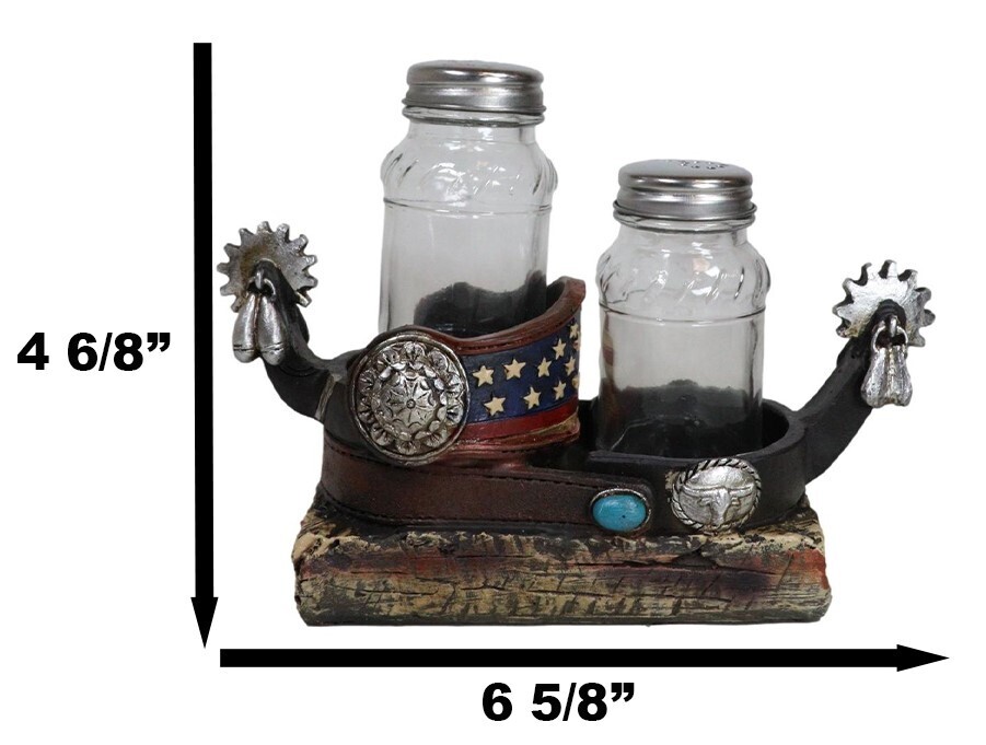Western Cowboy Boot Spurs USA Flag Conchos Faux Leather Salt Pepper Shakers Set