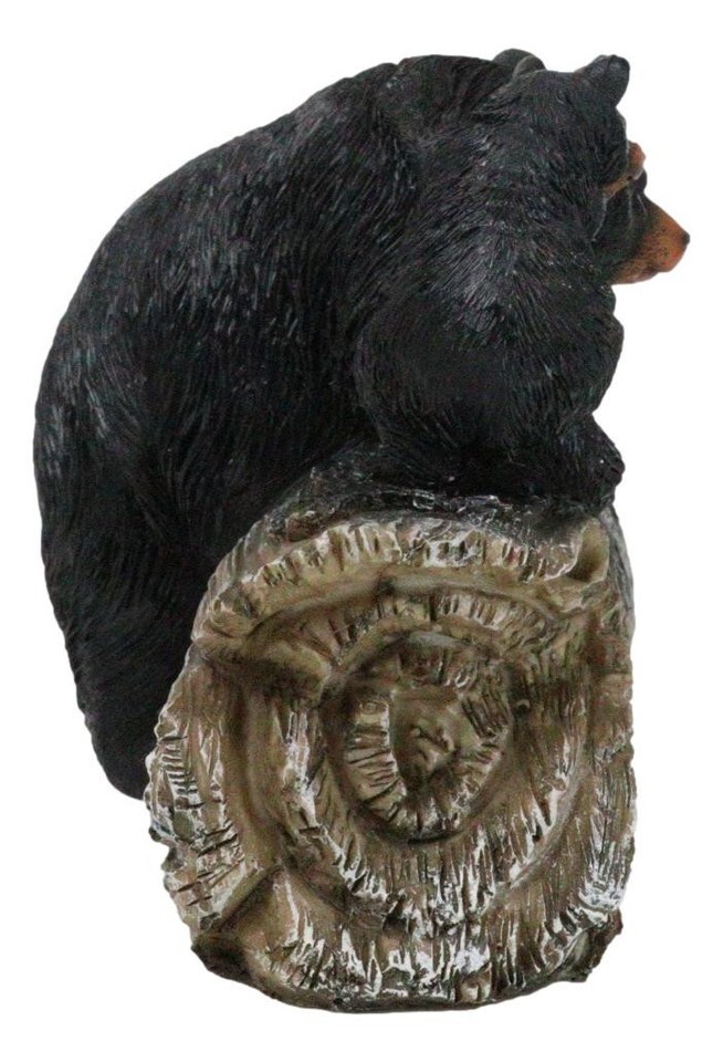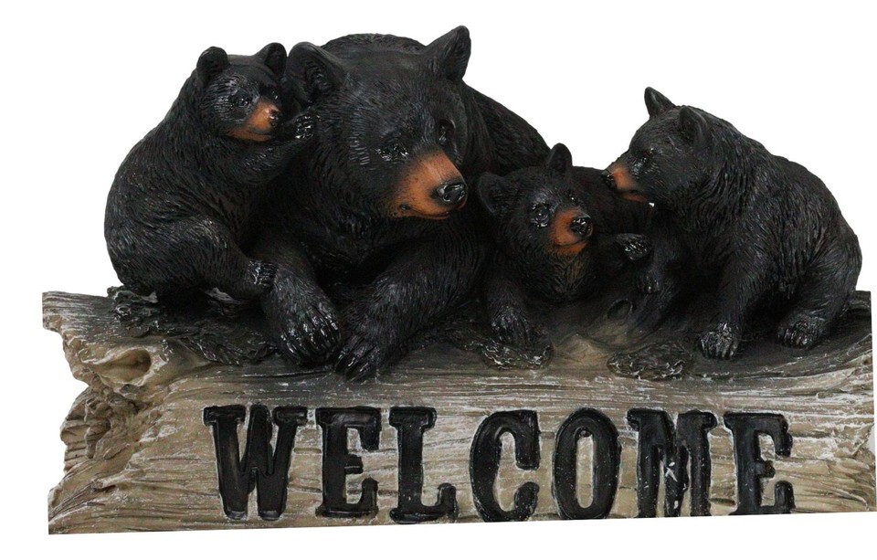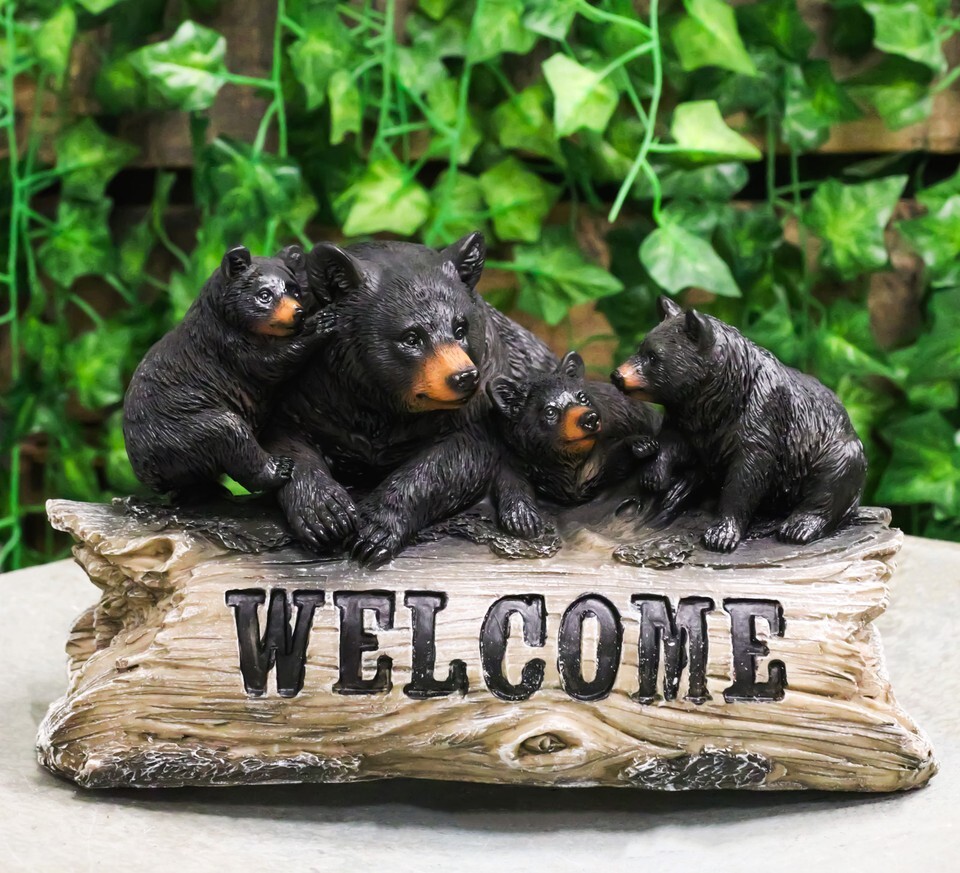 Rustic Forest Black Mama Bear And 3 Cubs Sitting On Welcome Log Sign Figurine
