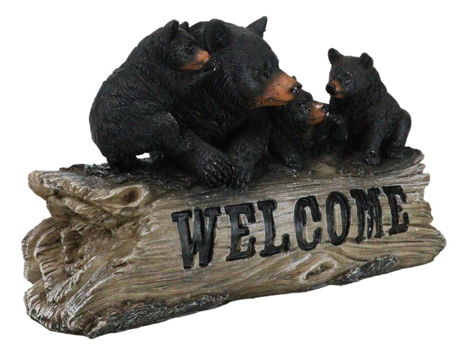 ? Welcome warmth and charm into your space with the Forest Black Bear Mother and 3 Cubs Welcome Desktop Plaque. This delightful piece features a loving mother bear and her three playful cubs perched on a beautifully crafted faux wooden log, with the word "Welcome" elegantly displayed in front. The intricate detailing captures the cozy bond between mother and cubs, making it a perfect addition to any home or office.