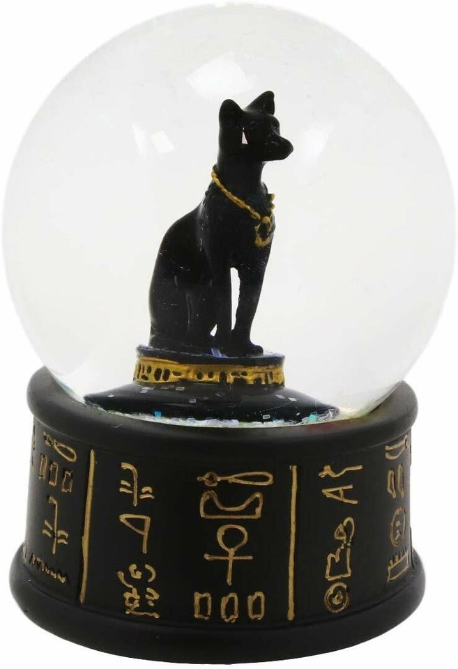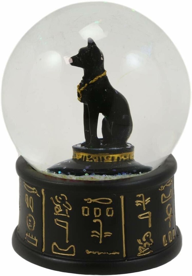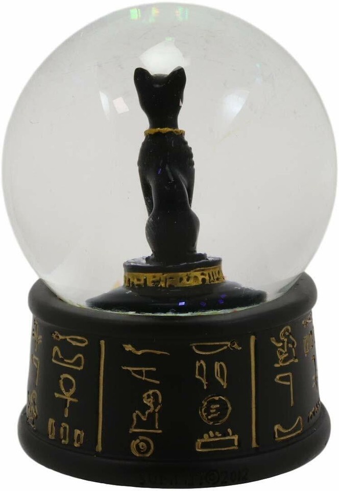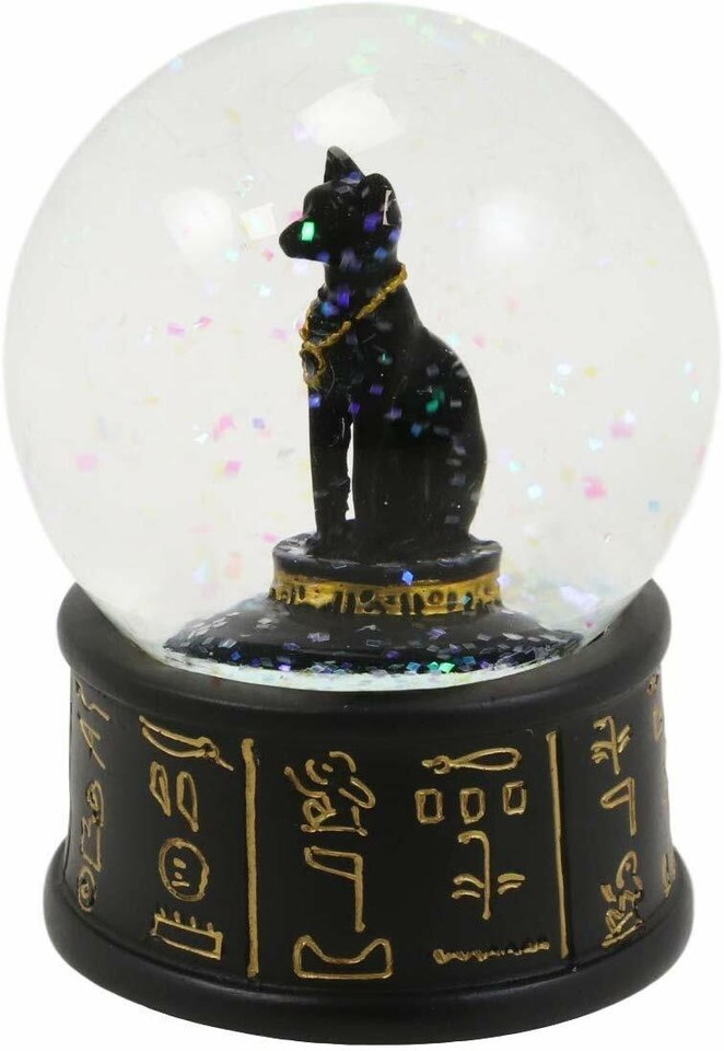? This Egyptian Goddess Bastet water globe features the feline deity of the home and protection in the cat form, sitting in repose. The water globe also has a unique black and gold colored base decorated with Ancient Egyptian Hieroglyphs symbols.