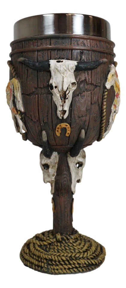 ? The original bunkhouse was a rough, simple building, often fashioned from the wood boards torn off old barns that provided sleeping quarters for ranch hands. Horse tack, wagon wheels and cow skulls were frequently tacked to weathered planks on the outside, while Western hats and ropes hung on the inside walls. Adding cozy ambiance, the whole place would smell of coffee brewing in an enamel pot on a wood-burning stove. These symbols and elements are all infused into the body of this wine goblet.