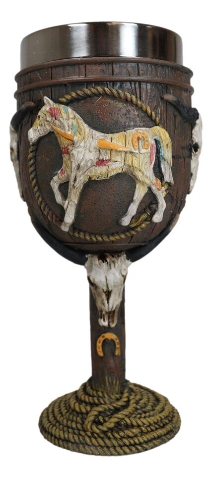 ? This Featured Trail Of Painted Ponies Wine Goblet is made of high quality resin with stainless steel liner, individually hand painted and polished. Color Tone May vary from pictures. Handwash only, applying soap to the stainless steel liner cup but using warm water/very mild soap on the resin housing.