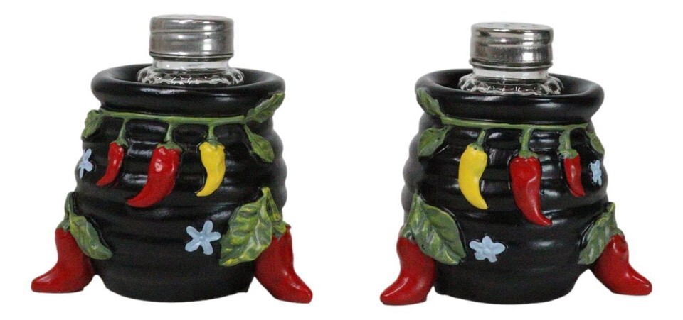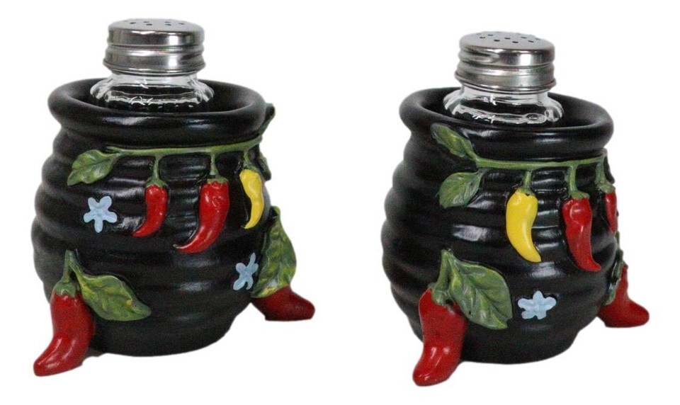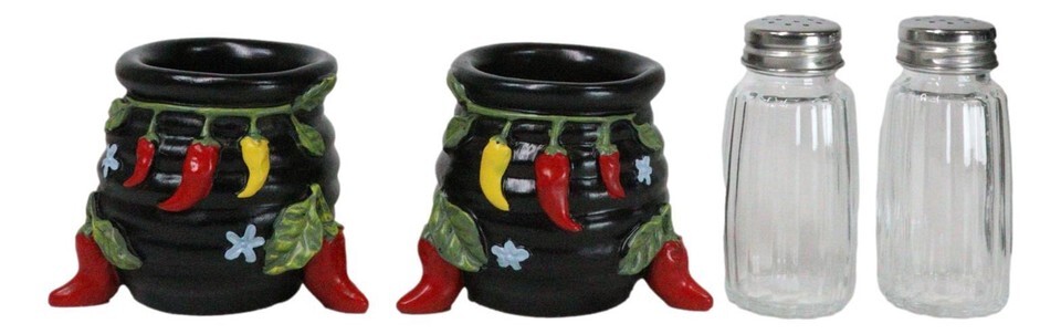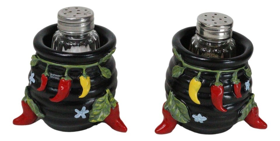 ? Spice up your kitchen with our Pot of Chili Peppers Canisters Salt and Pepper Shakers Holder figurine set! This vibrant and charming set features 2 delightful canister jar pots with colorful chili peppers motifs, adding a touch of southwestern flair to your dining space. Perfectly designed for both functionality and decor, the canister jars will hold glass salt and pepper shakers. 2 glass shakers are included.