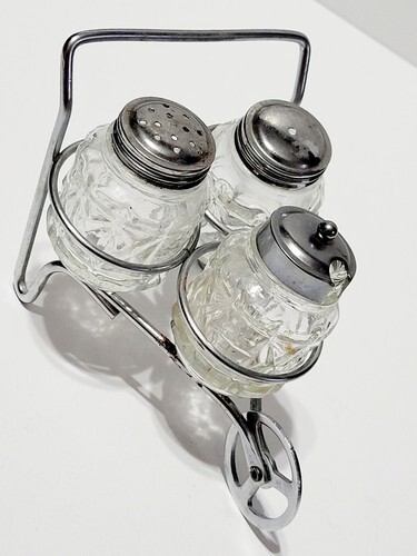 ? This Chili Pot salt and pepper shakers holder set each measures approximately 3.5" tall, 3.5" long and 2.75" deep.