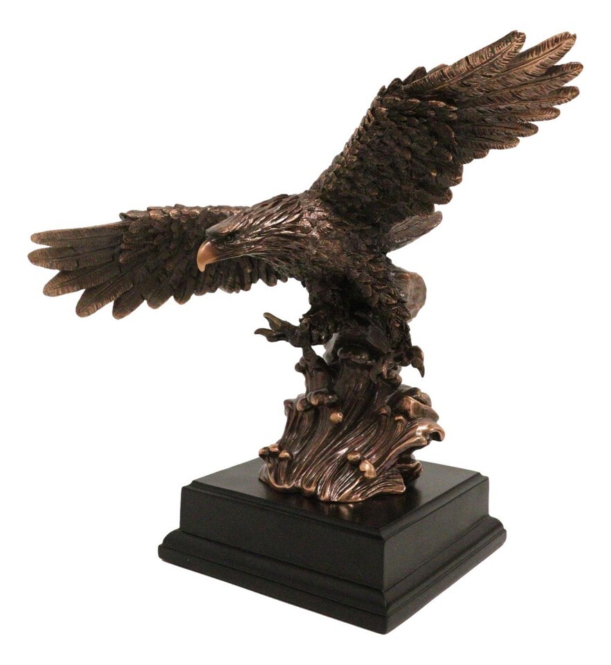 ? This Majestic Bald Eagle Figurine is made of the highest quality resin, undergoing the process of bronze electroplating giving it a uniform shine on the inside as well as the surface of the figurine. To add sculptural aesthetics and display worthiness, we add accent faux black wooden base to the sculpture.