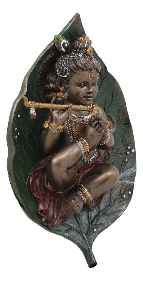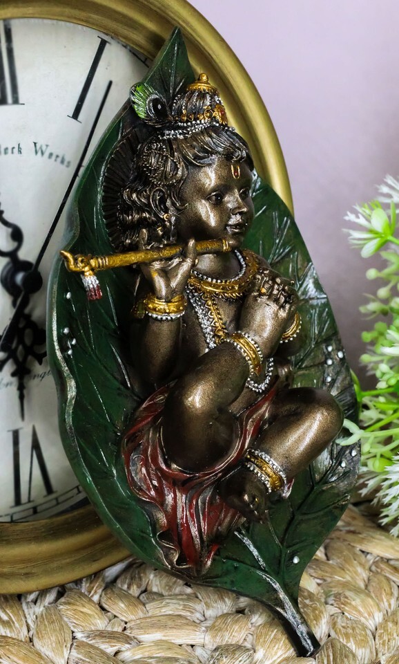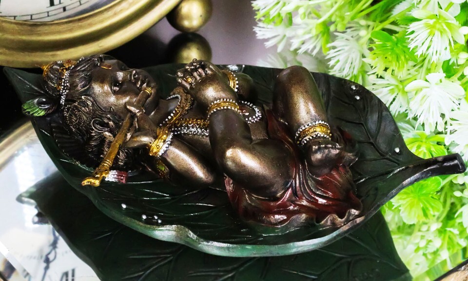 ? This Baby Krishna-Vishnu Sleeping On Peepal Leaf Statue is made of designer composite resin mixed with bronze powder, hand painted and polished individually. Color Tone may vary
