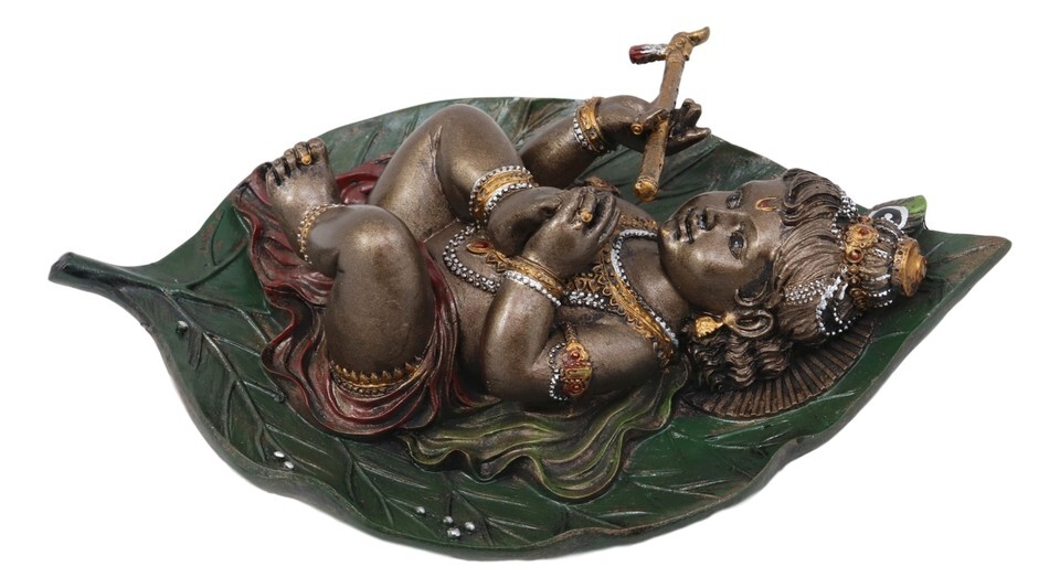 Lord Krishna as Baby Laying On Peepal Banyan Leaf Hindu Figurine 6"H Statue