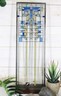 ? On this glass panel, enamel colors are individually applied to a single sheet of glass which is then kiln fired to permanently fuse the enamels to the glass. The glass is then metal framed and includes both a hanging chain and a wooden plaque base.