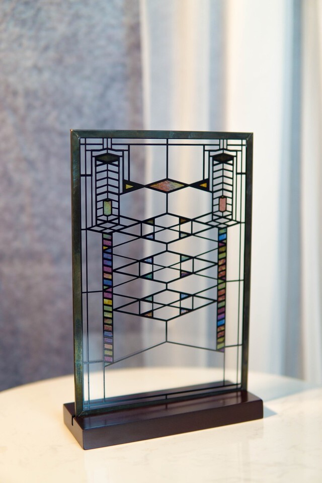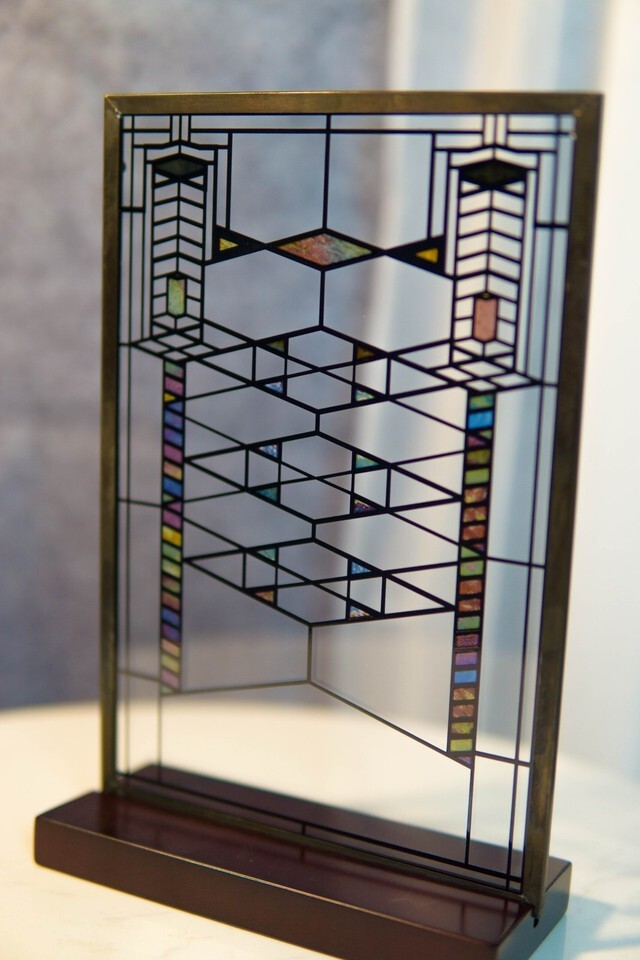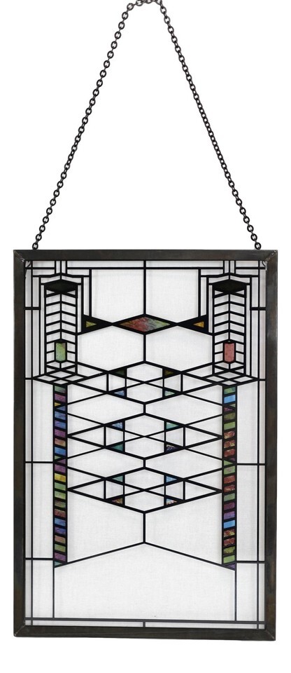 ? The Frank Lloyd Wright Robie Stained Glass Suncatcher is adapted from one of the distinctive art glass doors in the Frederick C. Robie House, located in Chicago, Illinois, designed in 1908 and completed in 1910. Its dramatic horizontal appearance is enhanced by banks of art glass windows and doors. The handsome geometric designs, twenty-nine of which are uniquely different, although all follow the same theme, were also created by Wright.