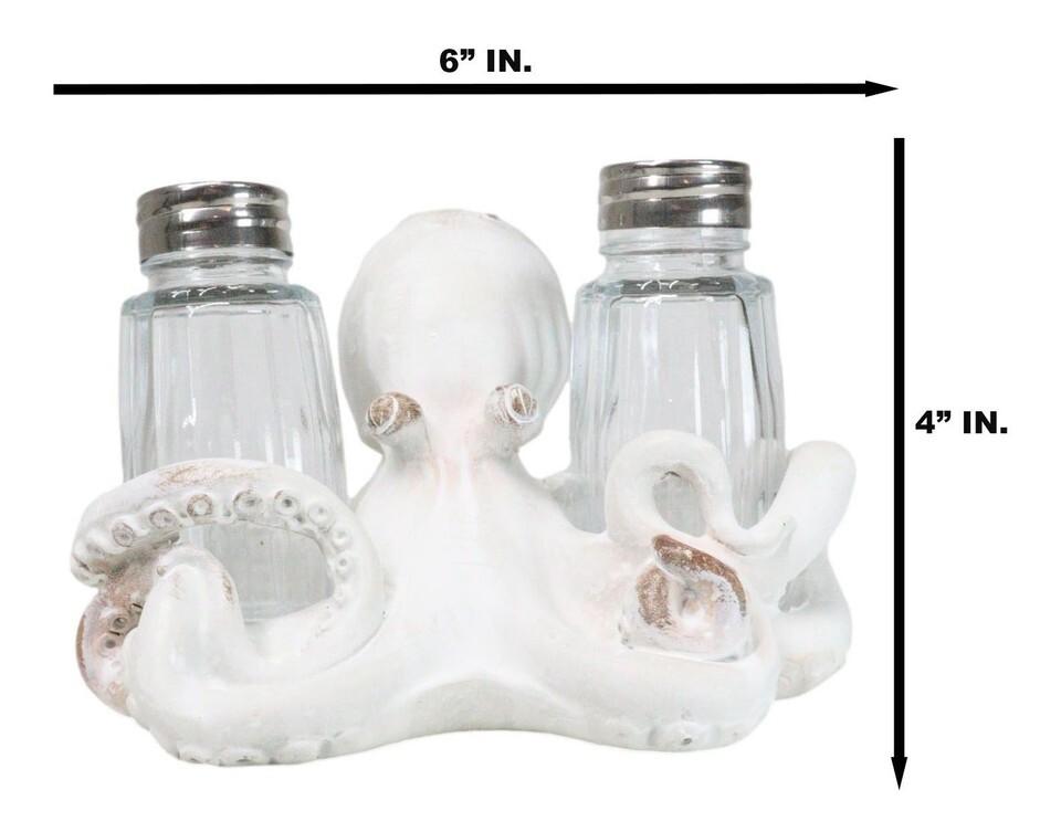 Antique White Nautical Marine Cephalopod Octopus Salt Pepper Shakers Holder Set