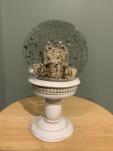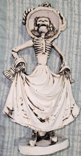 ? This Love Never Dies Wedding Skeleton Couple in Black Roses Wreath figurine is 5.75" tall, 5.5" long and 3.25" deep approximately. The sculpture weighs about 1.25 pounds.