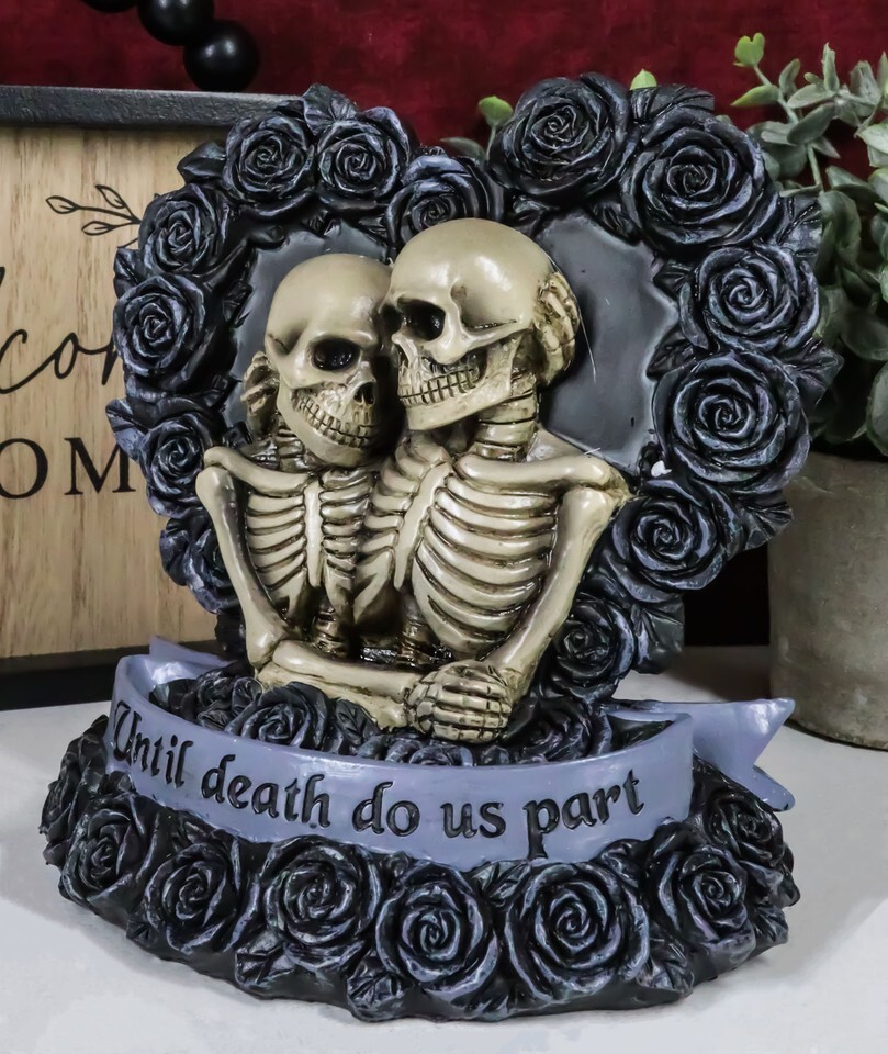 ? This Love Never Dies Wedding Skeleton Couple in Black Roses Wreath figurine is made of designer composite resin, hand painted and polished individually. Color Tone may vary